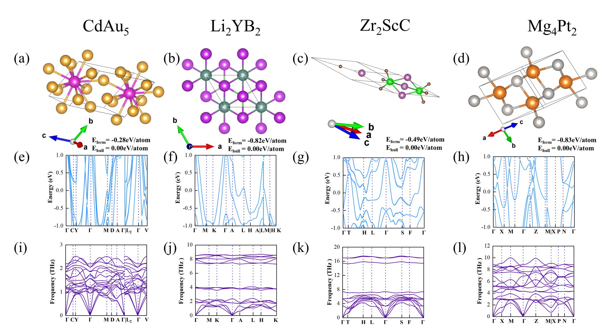 4.稳定性与拓扑性能判断:先是粗算生成拓扑非平庸材料的形成能和声子谱,然后通过第一原理计算验证,并结合M3GNet筛选出32种热力学和声子谱稳定的材料。最终,基于拓扑量子化学(TQC)判断拓扑类别,得到4种拓扑绝缘体和16种拓扑半金属。