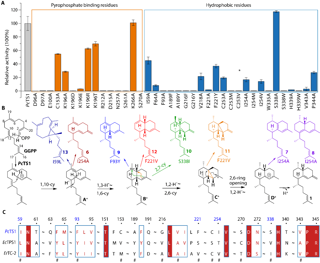 在解析PcTS1催化机制的基础上,研究团队还对该酶进行了工程改造,通过特定氨基酸的突变,可以有效地改变关键氨基酸与底物的相互作用,从而调控催化路径,生成新的产物。这一研究成果为酶的定向进化和小分子药物的设计提供了新的思路。