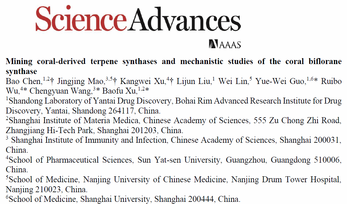 珊瑚活性萜类成分的生物合成研究是国际上近年来才开始的前沿和热点研究领域。继去年beat365唯一官网医学院郭跃伟团队与合作者首次报道非柔性Eunicellane型二萜合酶MicA的生物合成机制(Nat. Commun.2024,15, 5940),近日,郭团队与烟台新药创新山东省实验室、中科环渤海高研院海洋药物研究中心的徐宝福团队在珊瑚萜类的生物合成领域研究又取得重大进展,作为共同通讯作者,联合中国科学院上海免疫与感染研究所的王程远团队以及中山大学的巫瑞波团队,在国际顶级期刊《Science Advances》上发表了题为“Mining coral-derived terpene synthases and mechanistic studies of the coral biflorane synthase”的研究论文。