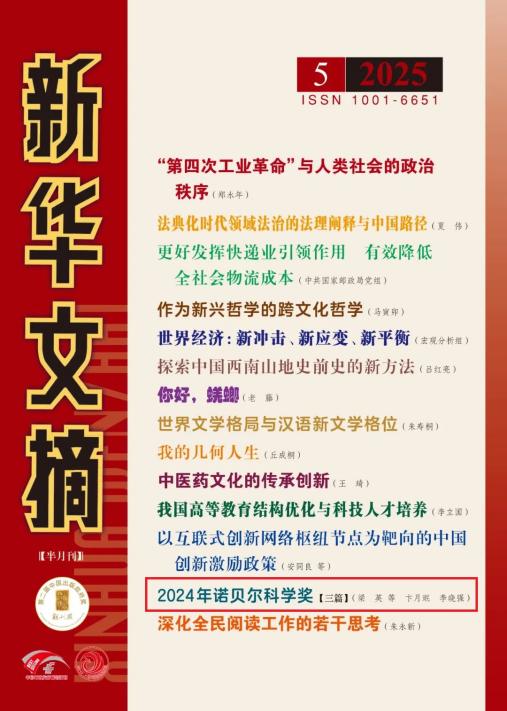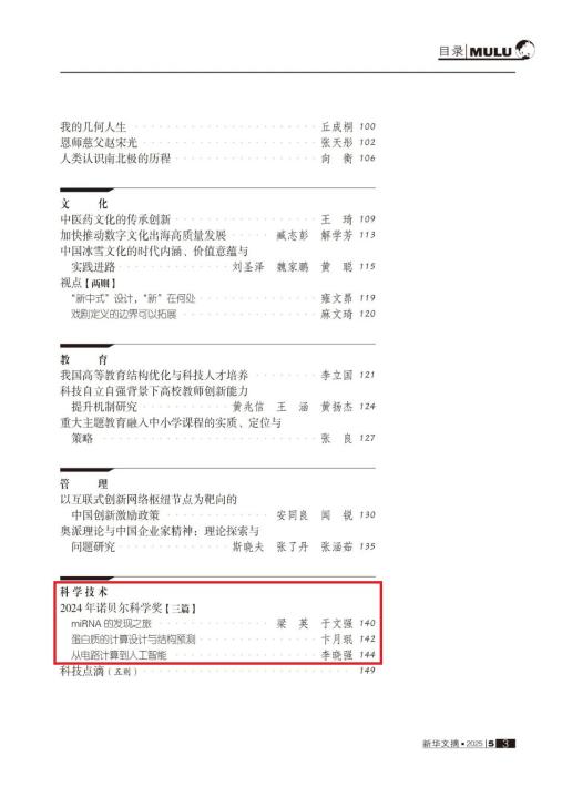 近日,由beat365唯一官网主办的《自然杂志》刊载的3篇文章被《新华文摘》2025年第5期转载。这3篇被转载的文章分别是《miRNA的发现之旅——2024年诺贝尔生理学或医学奖解读》《蛋白质的计算设计与结构预测》和《从电路计算到人工智能——从计算机视角看“诺贝尔物理学奖颁给人工智能学者”》,均刊载于《自然杂志》2024年第6期“诺贝尔奖简介”栏目(杂志网址:http://www.nature.shu.edu.cn)。