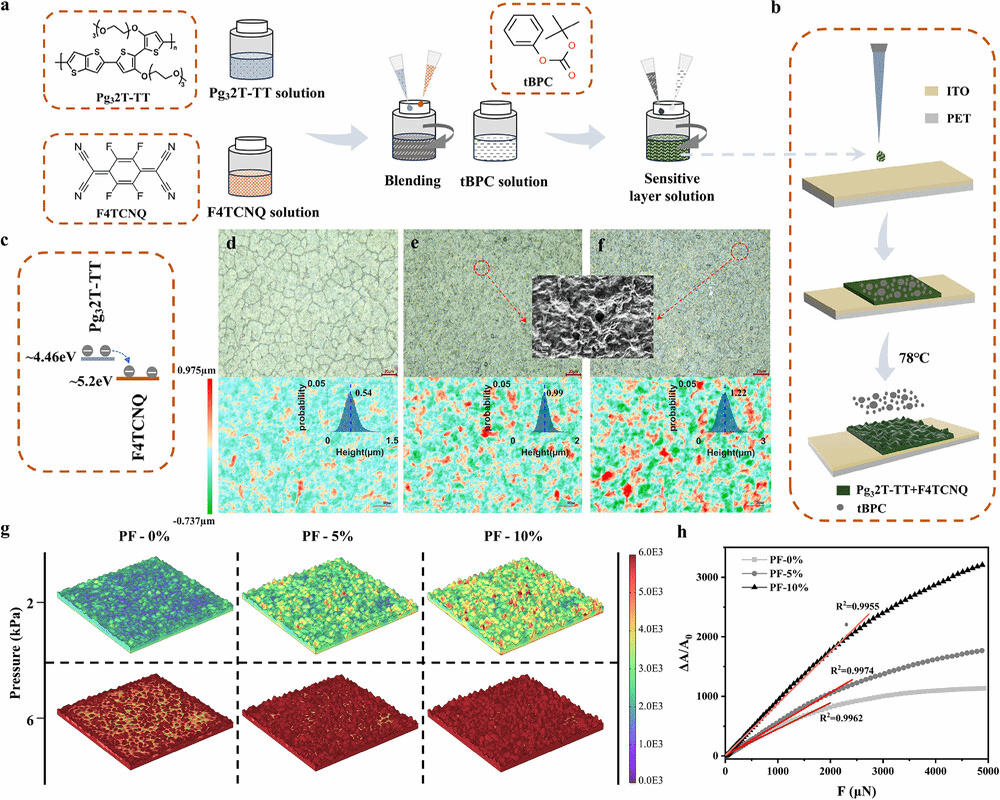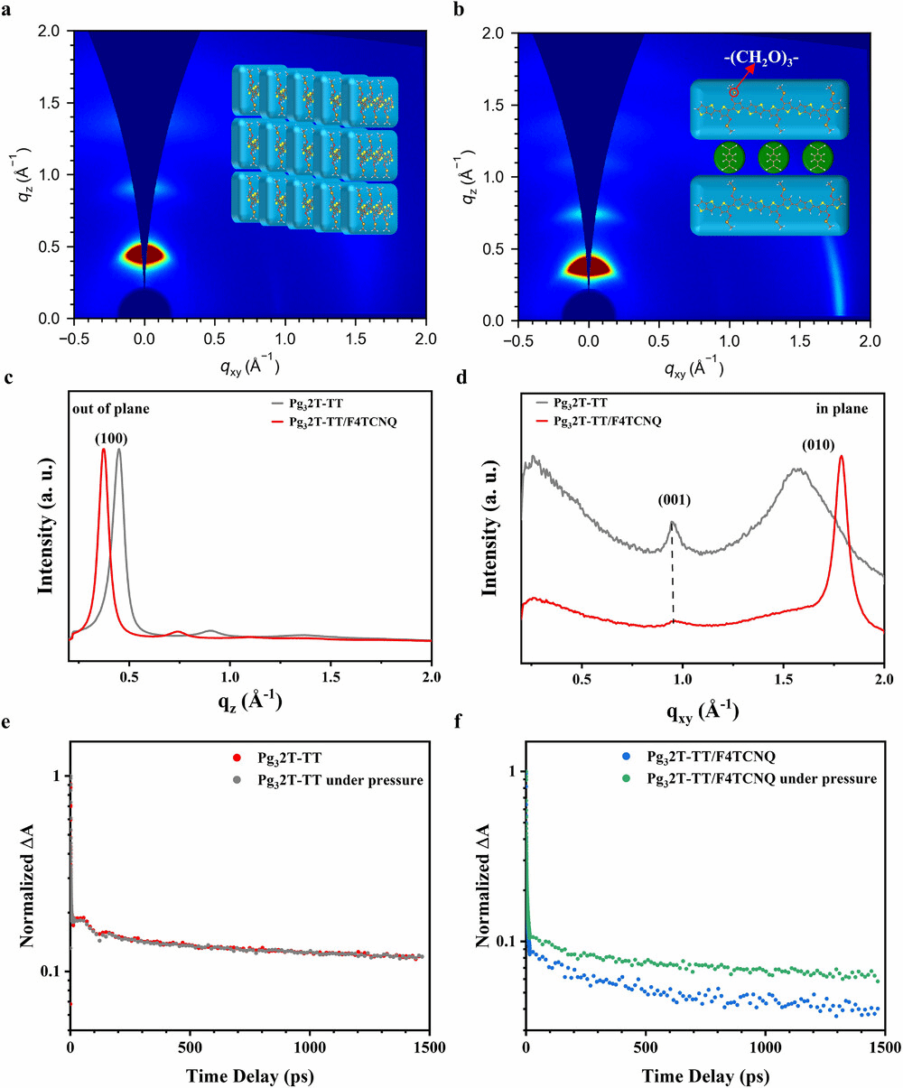 随后,在制备完成后,作者对传感器的工作机理进行了分析。从宏观角度,使用有限元软件分析了传感层在受压时的压缩变形行为,解析不同混入比的牺牲材料与导电聚合物工作时的灵敏度与线性响应范围。从微观角度,采用GIWAXS技术揭示F4TCNQ的掺杂位点以及对Pg32T-TT聚合物薄膜分子堆积行为的调控效应。另外,通过瞬态吸收光谱分析了压力诱导下掺杂剂对聚合物载流子寿命的影响。