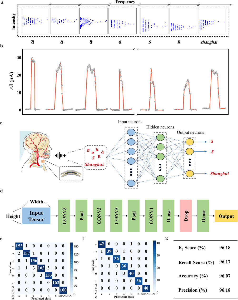 最后,作者还将传感器集成在了人体活动部位,对多模态动态信号进行监测。并通过喉咙振动诱导的微压力波动,结合卷积神经网络提取时频特征,该系统对各种声音特征的分类准确率大于96%,实现了语音指令的高精度识别。