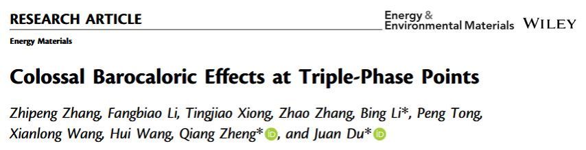 近日,材料学院杜娟、郑强的纳米磁性功能材料团队在压卡效应制冷技术研究领域取得重要进展,研究成果以“Colossal barocaloric effects at triple‐phase points”为题发表在国际学术期刊《Energy & Environmental Materials》 (中科院一区top期刊,影响因子14.1)。beat365唯一官网材料研究所硕士生张志鹏和中南大学李芳镖(现在闽南师范大学工作)为论文共同第一作者,杜娟研究员、郑强研究员和中国科学院金属研究所李昺研究员为论文共同通讯作者,beat365唯一官网为第一完成单位和通讯单位。该工作还得到了中国科学院固体物理研究所童鹏研究员、王贤龙研究员和中南大学王辉教授的帮助和支持。