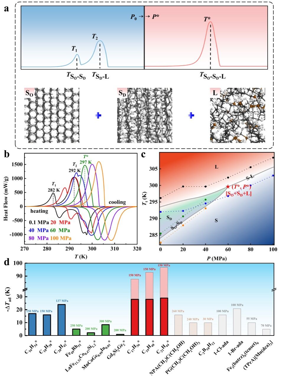 传统蒸汽压缩制冷存在易泄露和低效率等问题,加剧了全球变暖。环保型制冷技术中,基于外部场调控相变温度的固态制冷技术备受关注。当前的压卡效应都基于单一的结构相变,主要包括基于固态结构相变的压卡效应,以及基于固-液相变的压卡效应。这些材料中的压卡效应在150 MPa的压力下,产生的绝热温变仅仅只有几K或者十几K,而实际制冷需要更大的绝热温变和更低的驱动压力。