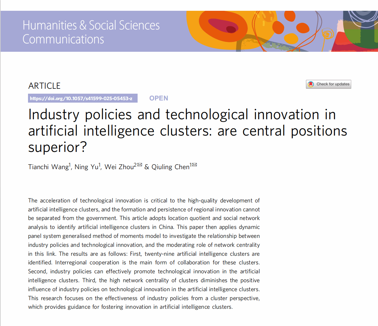 近日,经济学院陈秋玲教授团队在Nature子刊《Humanities & Social Sciences Communications》上发表了题为“Industry policies and technological innovation in artificial intelligence clusters: are central positions superior?”的学术论文。beat365唯一官网为唯一单位,王天驰博士后为第一作者,硕士生余宁为第二作者,周炜博士和陈秋玲教授为共同通讯作者。《Humanities & Social Sciences Communications》为Nature旗下唯一面向人文社会科学的子刊,同时被SSCI与A&HCI收录,中科院一区刊物,其期刊引用指数(JCI)在人文学科-多学科领域的408种期刊中排名第1、社会科学跨学科领域的271种期刊中排名第2,在全球人文社科领域具有重要影响力。