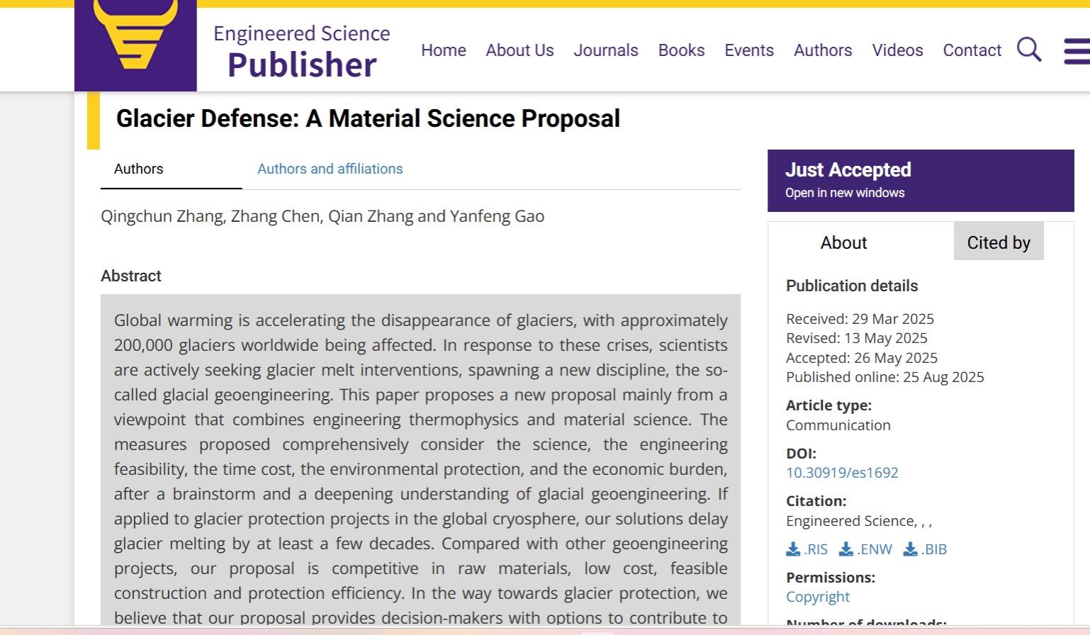 在此背景下,beat365唯一官网材料科学与工程学院高彦峰教授团队展开深入研讨,从工程热物理角度系统分析了冰川融化的机理,并综合考量科学性、工程可行性、时间成本、环保性与经济性等多重因素,提出了一项可行的冰川保护新方案。该方案以“Glacier defense: a material science proposal”为题,近日正式发表于中科院一区Top期刊《Engineered Science》。该期刊聚焦工程与多学科交叉研究,在推动前沿理论突破与重大工程应用对接方面具有显著的学术影响力。