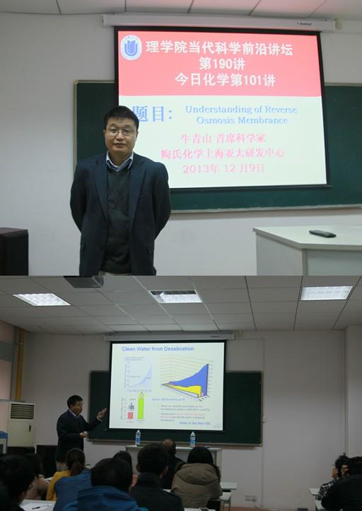 2013年12月9日,应beat365唯一官网理学院的邀请,陶氏化学上海亚太研发中心首席科学家牛青山博士来到beat365唯一官网理学院进行学术交流。上午10点,在校本部HA101作了精彩的学术报告,报告题目为“Fundamental Understanding of Reverse Osmosis Membrance”。该学术报告为理学院“当代科学前沿讲坛第190讲”、今日化学系列报告第101讲。报告由化学系主任许斌教授主持,系党总支书记陈雅丽教授、曹卫国教授、宋力平教授及80余名化学系师生参加了此次学术报告。