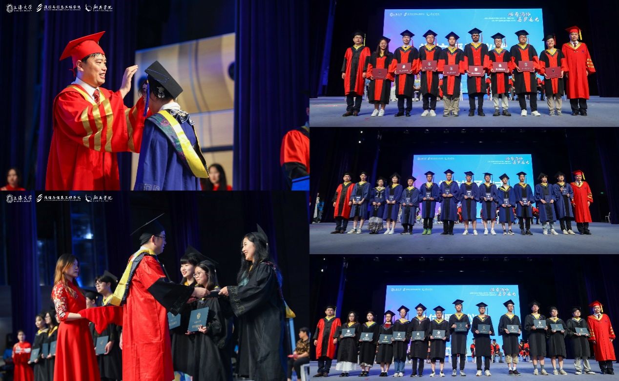 仪式环节,由校党委副书记、副校长胡大伟逐一为毕业生们拨穗正冠,通信学院院长庞拂飞为毕业生颁发学位证书,党委副书记、副院长陈涛为毕业生们赠送贺信。在悠扬激昂的校歌旋律中,毕业生们身着学位服,秩序井然地踏上舞台,共同参与并见证这一生中重要的时刻。镜头前,他们绽放出最灿烂的笑容,定格下这美好瞬间,将青春的印记镌刻在这永恒的记忆之中。
