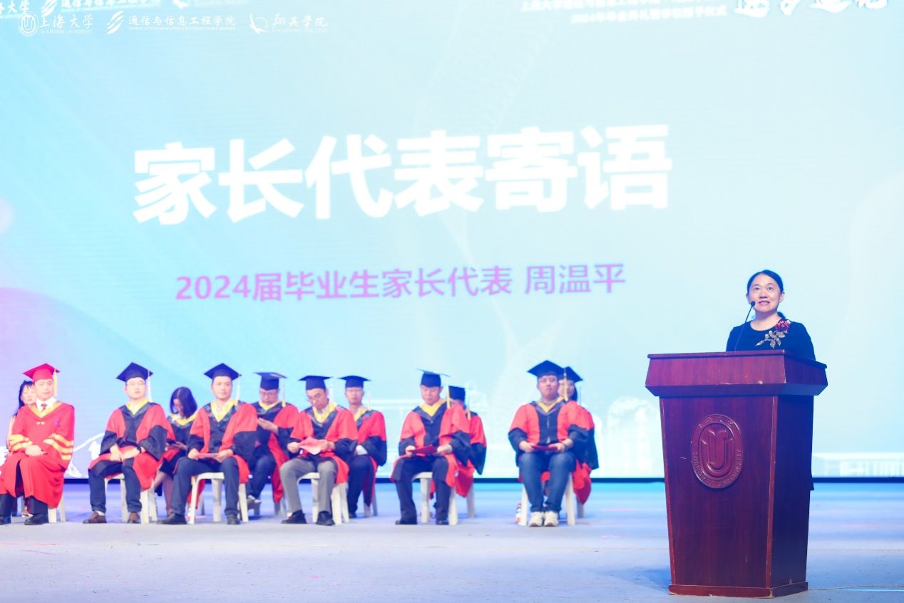 在这一值得铭记的时刻,2024届本科毕业生周俊儒的母亲周温平女士,以一位家长代表身份,登台发表讲话。她用温暖而诚挚的语言,向学校致以最高的敬意,向老师们表达了深切的感激之情,同时也向那些在学习生活中彼此扶持、共同进步的同学表达了由衷的谢意。最后鼓励所有的毕业生们努力成为有担当、肯奉献、积极向上的时代新青年。