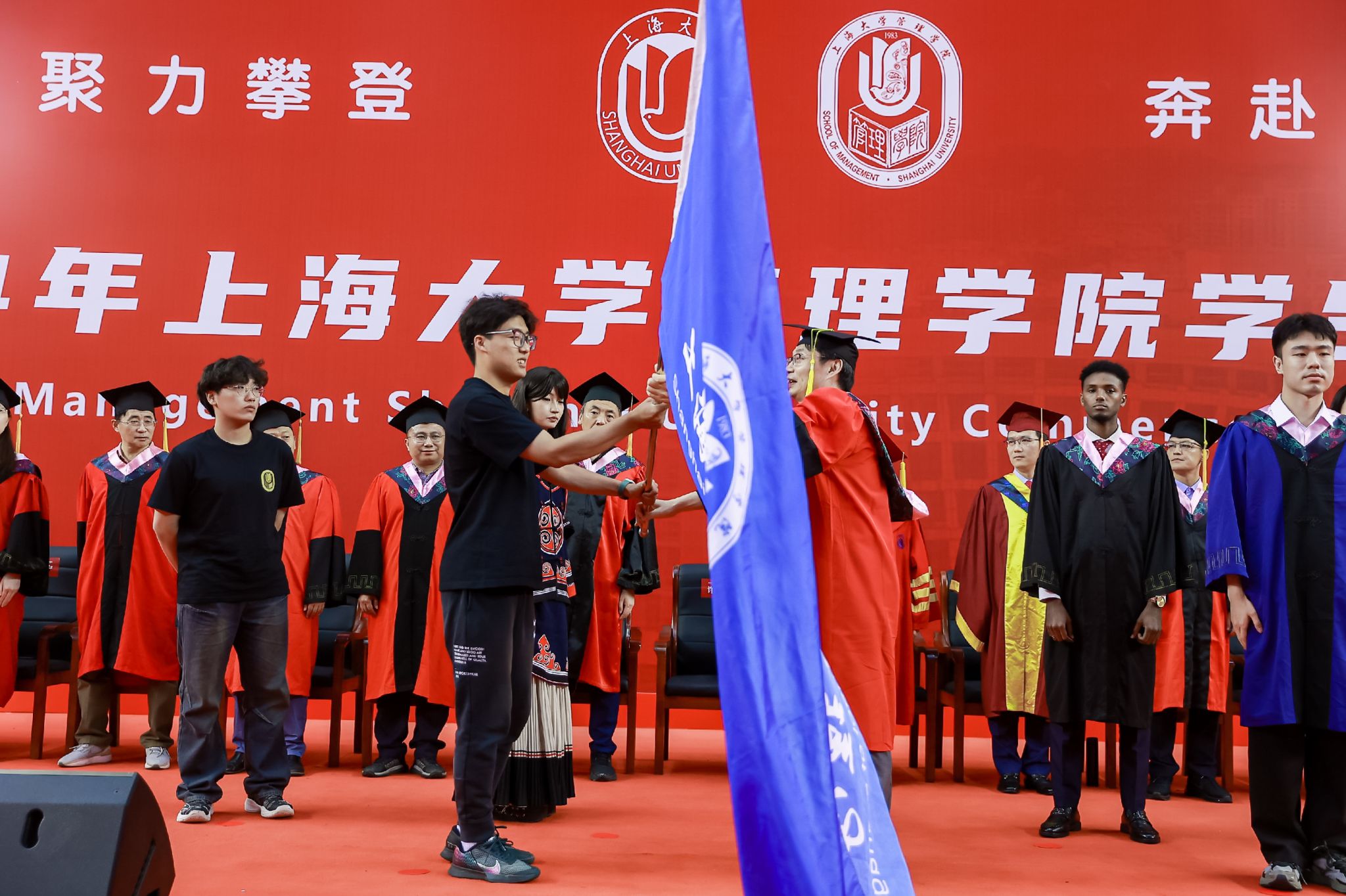 前路虽漫漫,终有重逢日。为加强毕业生与学院的联络,学院党委副书记、副院长马亮老师为校友联络员严子芊、袁飞、桂嘉成、金培妍、许字轩、吴欣怡、李苏琦、张晚晴、屈妙言、张悦、赵鹏宇、宋媛、任依然、辛晓海、方海杰、彭可欣、蒋铭霁、潘旭、高轲、赵文毓颁发聘书。随后,2024届毕业生代表马泽正、辛乐、赛德向学院党委书记许学国老师交还院旗,许书记向新生代表刘世宇、魏澄贤、且萨东黎授旗,愿上大“自强不息,道济天下”的精神在院旗传递中代代传承。随后,同学们还认真观看了钱伟长老校长毕业赠言视频,深受触动,这份厚重的嘱托和期望仿佛点燃了他们心中的火焰,激励着他们在未来的道路上不断前行,努力践行上大精神,为国家和人民贡献自己的力量。