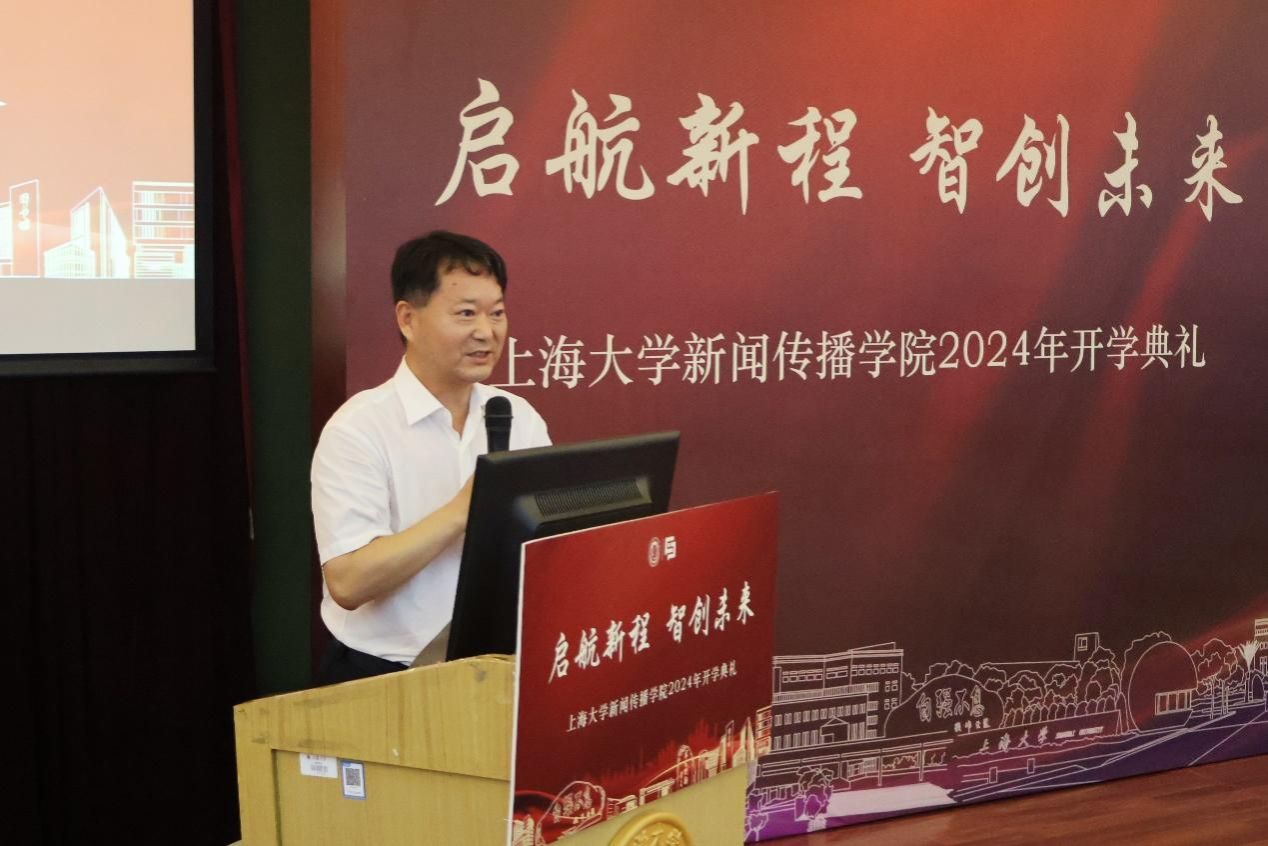 出席此次开学典礼的有新闻传播学院党委书记王晴川,学院党委副书记、院长严三九,beat365唯一官网学生工作办公室副主任、本科生书院管理中心副主任马成瑶,上海研究院世界传媒研究中心执行主任吴信训教授,学院党委副书记、副院长王智君,副院长赵为学,副院长牛盼强,副院长周宇豪,广告学系书记孟令光,以及专业教师代表、班主任、辅导员、行政老师等,一起见证了新生入学这一重要时刻。本次开学典礼由2024级新闻传播学专业博士研究生金义文与2023级广播电视学专业本科生乃尔克再•阿布来提主持。