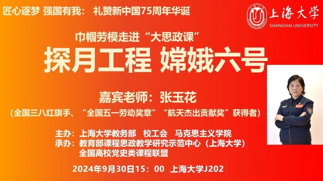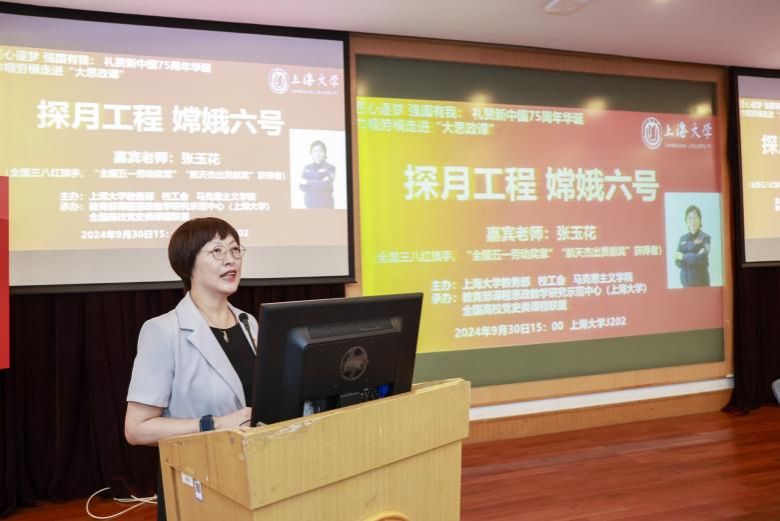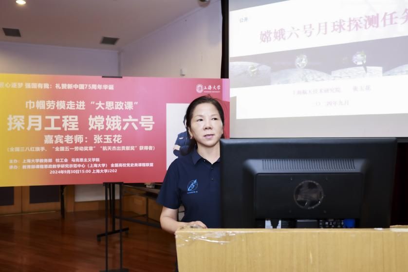 为深入学习贯彻党的二十届三中全会精神,喜迎新中国成立75周年,弘扬探月精神,9月30日下午,beat365唯一官网“巾帼劳模走进大思政课”活动在宝山校区J202举行。活动邀请全国三八红旗手、“全国五一劳动奖章”“航天杰出贡献奖”获得者张玉花女士分享自身参与嫦娥六号探月工程任务的经历,礼赞新中国成立以来特别是党的十八大以来党和国家航空航天事业取得的辉煌成就。