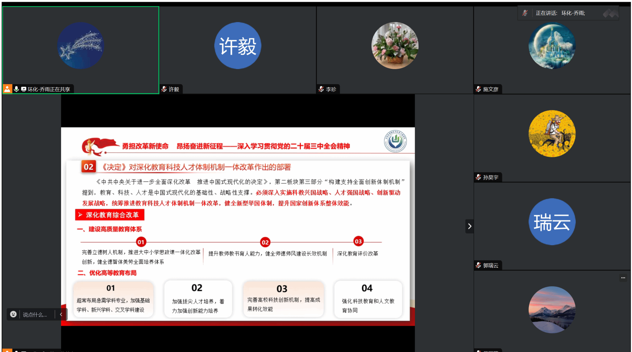为深入学习贯彻党的二十届三中全会精神,推动引领学院党员全面理解和把握全会的精神实质和核心要义,激发广大党员的责任感和使命感,10月14日,环化学院党委在环化楼915会议室举办学习贯彻党的二十届三中全会精神专题党课。学院党委书记钱冬英以“勇担改革新使命,昂扬奋进新征程——深入学习贯彻党的二十届三中全会精神”为题,宣讲党的二十届三中全会精神,学院党政领导班子成员、各系所负责人、教师代表于线下参会,各党支部书记、支委等在线上同步参加学习。