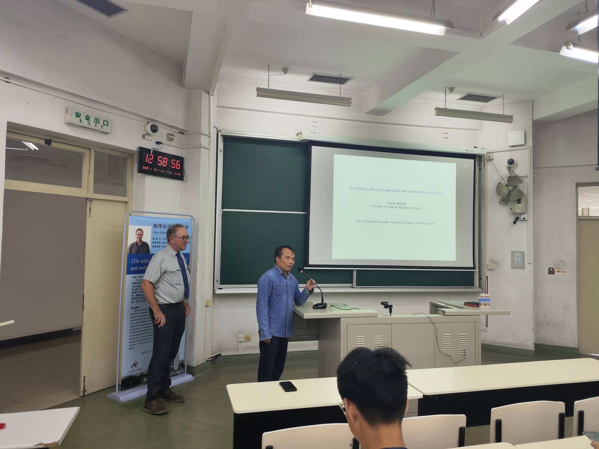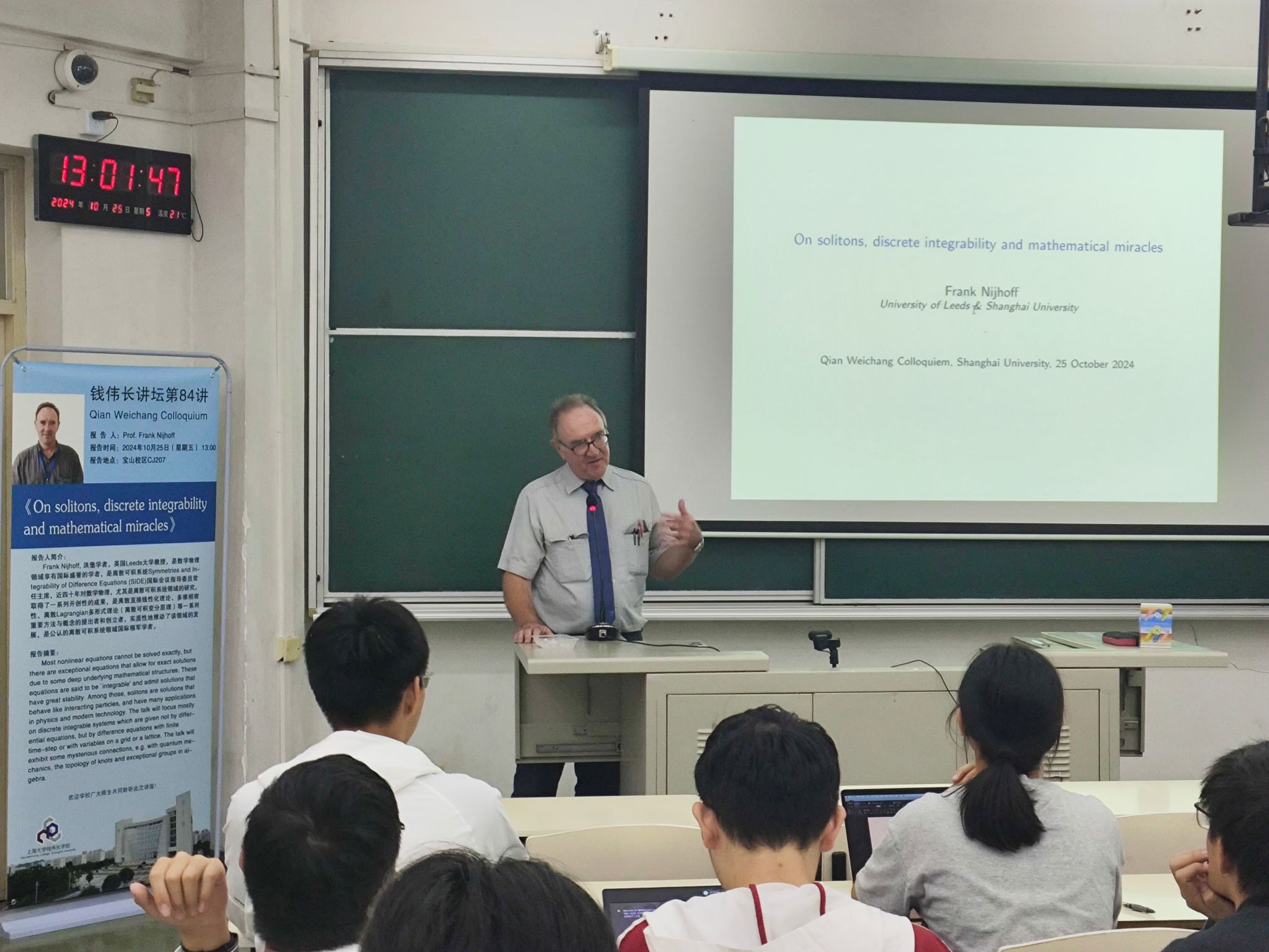 10月25日下午,钱伟长讲坛第84讲《On solitons, discrete integrability and mathematical miracles》在beat365唯一官网宝山校区CJ207会议室顺利举行,国际著名的数学家Frank Nijhoff教授应邀作主题报告,讲坛由钱伟长学院副院长许新建教授主持,钱伟长学院团委书记魏仲奇和24级本科生等共同出席了本次活动。