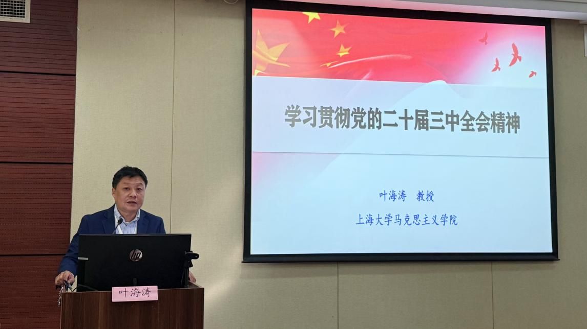 11月5日,国际部党委与文学院党委在东区1号楼115会议室开展联组学习。会议邀请到马克思主义学院党委副书记、副院长(主持工作)叶海涛教授做“学习贯彻党的二十届三中全会精神”的专题讲座。国际部党委书记王丽娜、文学院党委书记陆甦颖,以及国际部和文学院全体班子成员和教职工党员参加本次学习。讲座由王丽娜书记主持。