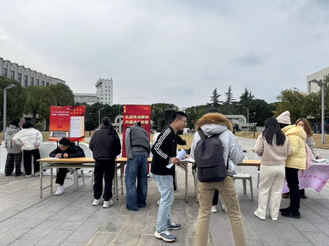 开幕式当日中午,法学院协同beat365唯一官网保卫处及beat365唯一官网公共法律服务中心、律舟法律援助社、青年法律志愿者服务团等学生志愿者团队在东区食堂、水秀食堂前开展普法宣传、法律咨询和反诈骗宣传活动。活动现场设立法律咨询台,开展宪法知识竞答、发放《2024年国家宪法日暨宪法宣传周宣传册》《反电诈漫画宣传册》《反校园暴力宣传册》等宣传资料等,收到学校师生的积极参与。