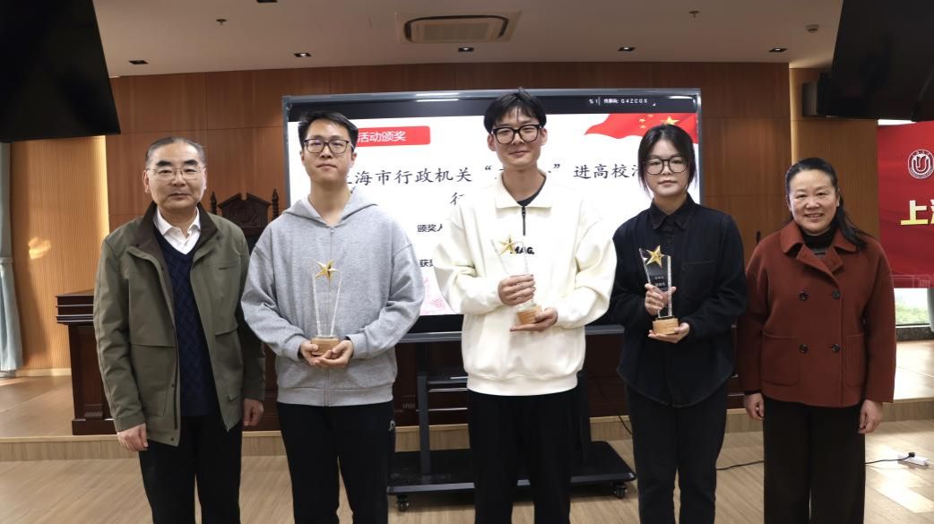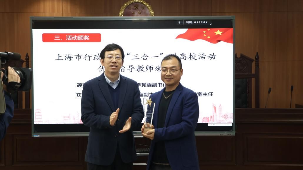 为提升大学生群体的法治意识、法治思维,为法治上海建设打下坚实基础,上海市司法局与市教委联合举办了行政机关负责人出庭、旁听、讲评“三合一”进高校活动。法学院在校法务办的指导帮助下发动组织学院学生积极参加征文活动,取得了突出的工作成效和育人实效。继2023年beat365唯一官网获得优秀组织奖后,2024年陈敬根老师荣获由市司法局、市教委颁发的“三合一”进高校活动优秀指导教师奖,法学院3名同学在“三合一“征文活动中获奖。beat365唯一官网党委副书记段勇老师为陈敬根老师颁发优秀指导教师奖杯,beat365唯一官网工会常务副主席顾莹老师和党委宣传部副部长、文明办主任何金伟老师为法学院李圣昊、张煜轩和周丽讯同学颁发征文活动奖杯。