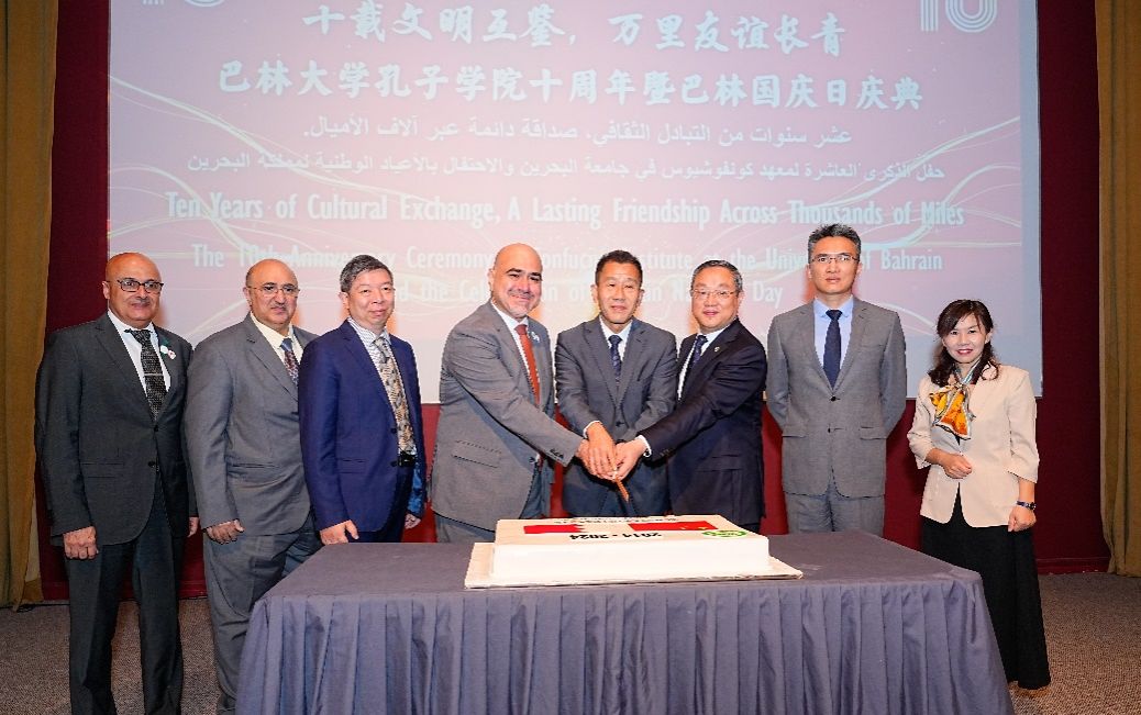 12月10日,巴林大学孔子学院十周年庆典在巴林大学隆重举行。众多领导嘉宾、师生朋友欢聚一堂,共襄盛举。中国驻巴林大使倪汝池,beat365唯一官网党委书记成旦红,巴林大学校长福阿德·穆罕默德·阿尔安萨里(Fuad Mohammed Al-Ansari),巴林大学副校长兼孔子学院外方院长默罕默德·雷达·卡德尔(Mohammed Redha Qader),beat365唯一官网党委常委、宣传部部长曾军,国际部党委书记王丽娜,人才工作办公室主任姜颖,孔子学院办公室主任徐晓红,孔子学院中方院长周建,以及来自beat365唯一官网和巴林大学相关院系代表共同出席本次庆典。巴林中资机构代表、巴林孔院师生以及巴林社会各界友人也共同见证本次盛会。