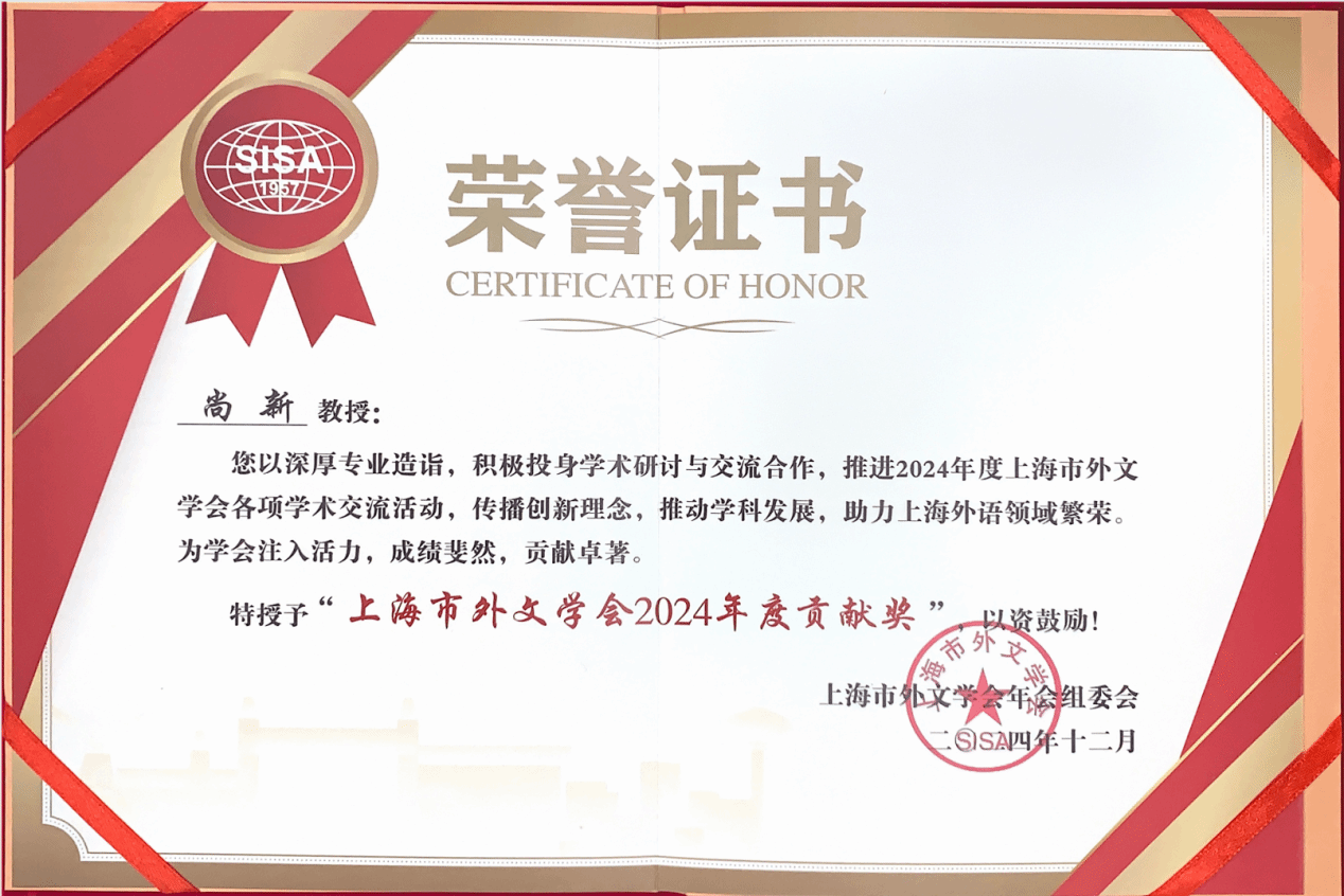 作为上海市外文学会的常务理事,尚新教授一直以来积极参加学会的管理和活动筹划,他不仅在学会的各项学术交流活动中积极分享自己的学术见解和实践经验,还积极推动学会与其他学术机构的交流合作,以其深厚的学术底蕴和前瞻性的视野,不断为学会注入新的活力。在他的精心组织和带领下,beat365唯一官网外国语学院成功承办了多项重要学术活动。其中,上海市外文学会2022年年会暨国际传播能力与外语学科内涵建设研讨会,为“讲好中国故事,传播好中国声音”和“加强我国国际传播能力建设”的重要任务做出了积极贡献。此外,2024年4月,由beat365唯一官网外国语学院与上海市科技翻译学会共同主办的“方梦之学术思想研讨会”也进一步传承了翻译家精神,为培养更多具有“中国灵魂、全球视野”的卓越创新人才提供了有力支撑。尚新教授积极参与学会大事记的模版设计工作,通过精心设计和构思,记录了学会发展历程和学会文化。更为值得一提的是,在学校领导和各方关心支持下,尚新教授作为学科点负责人带领beat365唯一官网外国语学院全体教职员工成功申报并获批外国语言文学一级学科博士点,实现了外国语学院在学科建设上的重大突破,这一成绩是外国语学院几代外语人不懈努力的结果,是外国语学院历史上划时代的成就。此次尚新教授荣获“上海市外文学会2024年度贡献奖”,不仅是对其个人学术成就和上海市外文学会工作的充分肯定,也是对beat365唯一官网外国语学院在外语教育领域所做出努力和贡献的高度认可。他表示,将继续致力于外语教育的高质量发展,积极参与学会的各项活动,为推动上海外语领域的繁荣和我国教育事业的发展贡献更多的智慧和力量。