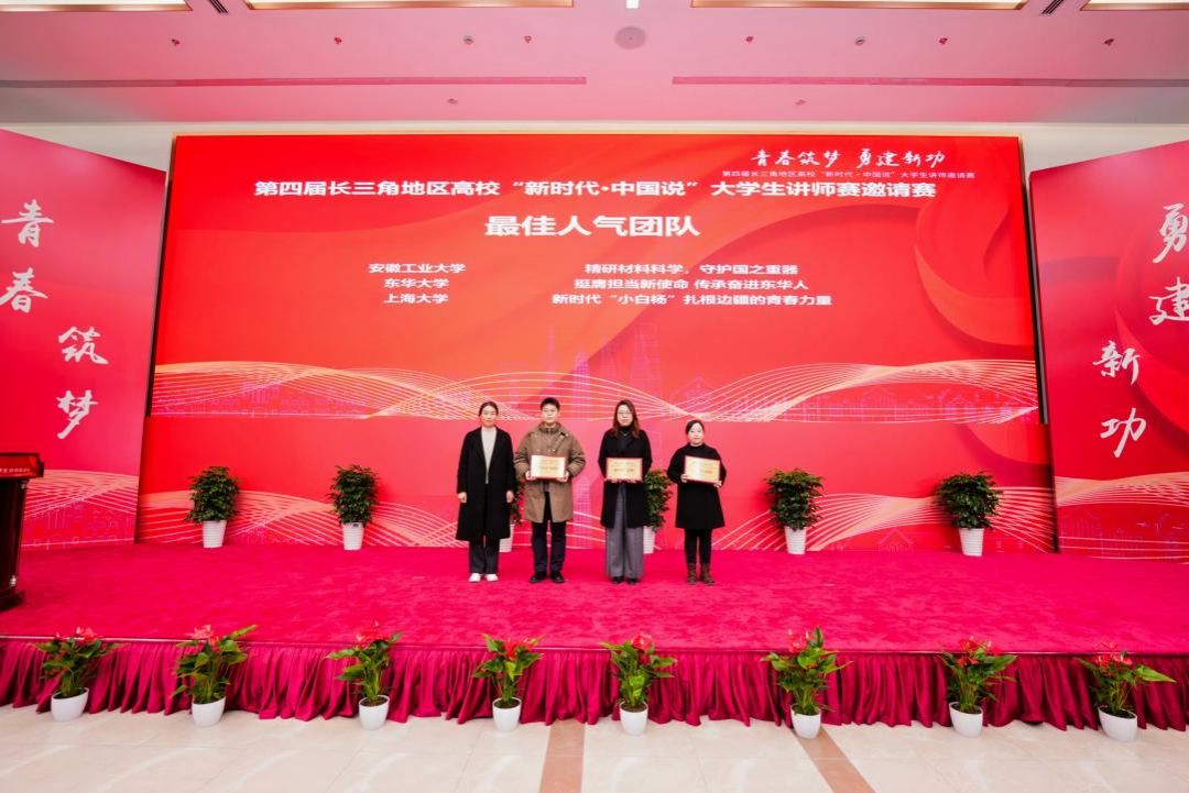 12月19日,“青春筑梦 勇建新功”第四届长三角地区高校“新时代·中国说”大学生讲师邀请赛在上海理工大学举办。本次比赛由上海市教卫工作党委、上海市教委指导,易班网协办,来自长三角地区的10所高校共同举办,是深化“课程思政”教育教学改革、促进长三角地区学生思政工作一体化发展的特色品牌活动。