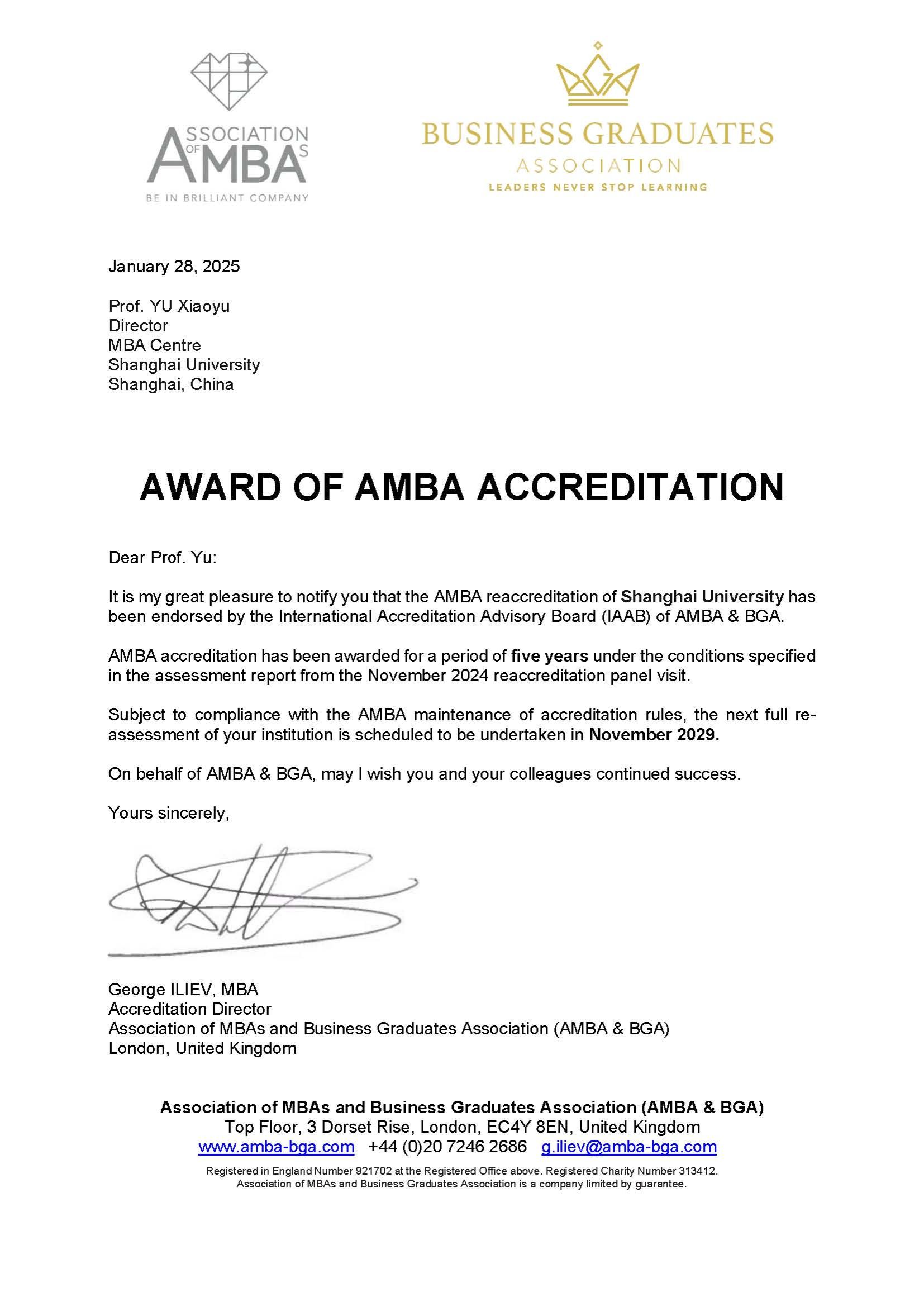 近日,beat365唯一官网MBA中心正式收到国际三大商学教育权威认证组织之一英国工商管理硕士协会(Association of MBAs, 简称AMBA)的贺信,宣布beat365唯一官网MBA中心成功通过了AMBA2024的再认证,且获得了五年最高期限。这是继2017年首次获得三年有条件认证、2020年获得五年(3年+2年)有条件再认证后的又一里程碑式成就。
