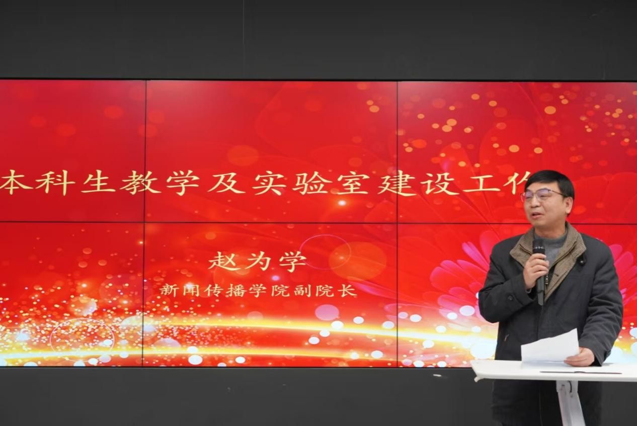 在本科生教学及实验室建设方面,新闻传播学院副院长赵为学从六个方面汇报了2025年度本科生教学及实验室建设方面的重点工作。一是推进学期制优化改革,做好本科人才培养方案的调整优化和配套教学运行工作,确保教学秩序和教学质量;二是举办AIGC背景下中国新闻传播学产教融合与实验实践教材建设研讨会;三是召开学院第二届本科教育大会;四是实现国家级称号课程零的突破;五是进一步培育孵化国家级教研教改项目与实现中国国际大学生创新大赛零的突破;六是培育本科层级国际化全英文课程模块。