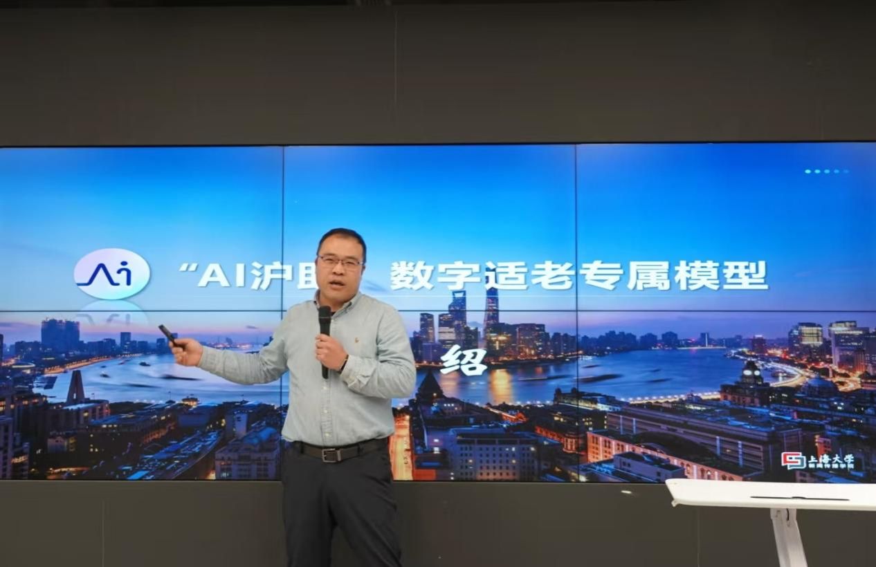 在智能媒体传播可视化展示环节,新闻传播学院挂职副院长王虎展示了数字适老专属大模型“AI沪助”,该模型集成日常聊天、病情自诊、社区办事、心理疏导等功能,是国内高校第一个智慧适老专属模型。