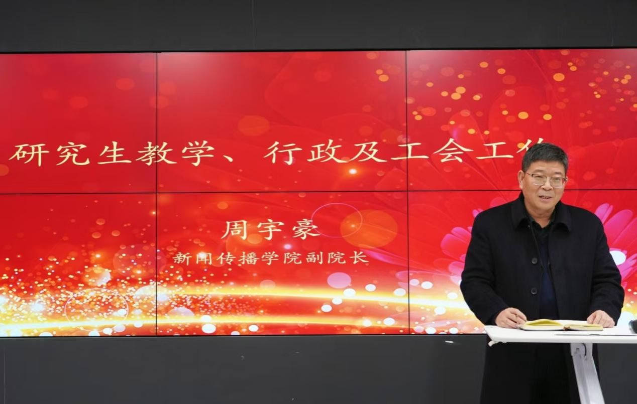 新闻传播学院副院长周宇豪汇报了2025年度研究生教学、行政及工会工作方面的重点工作。在研究生教学方面,做好招生、毕业、示范课程培育、首届研究生教育大会、第四届研究生学术论坛月、部校共建每月一课活动、补充完善业界导师制度、学位点评估准备工作、出版专业博士申报等工作。在工会工作方面,将持续做好教师福利发放等工作。在行政工作方面,将继续完善各项规章制度,做好辅楼装修建设,改善教师的科研空间,重点做好培训和非全研究生招生工作。