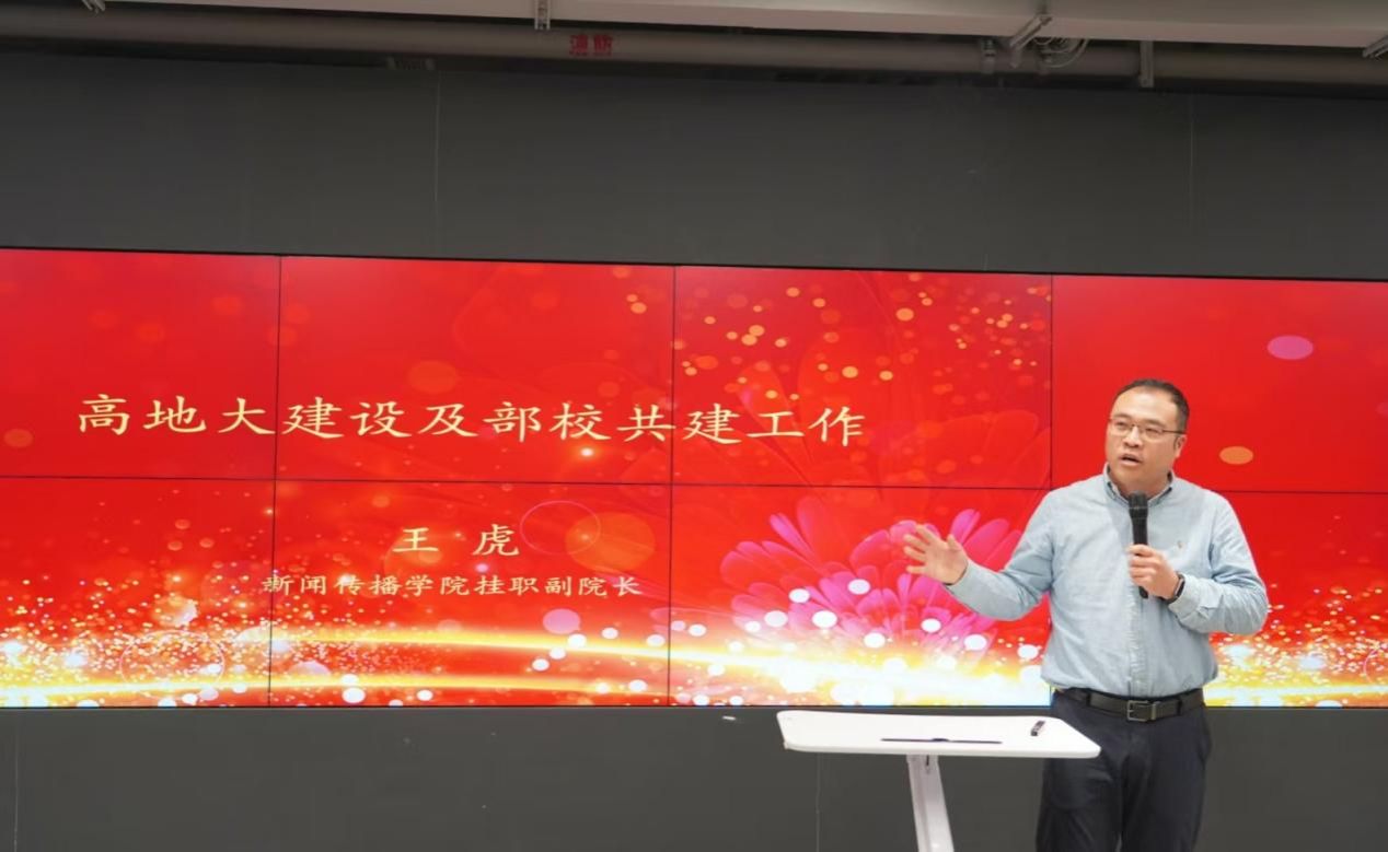 新闻传播学院挂职副院长王虎主要汇报了2025年度高地大建设及部校共建方面的重点工作。强调了学院在部校共建项目执行中将进一步提质增效,提高项目执行质量和资金使用效率的重要性。并介绍了科研激励绩效、青年教师培养计划经费和精品课程项目的激励机制。高地大项目的实施将聚焦于高水平科研平台立项和智能媒体传播理论体系建设等。