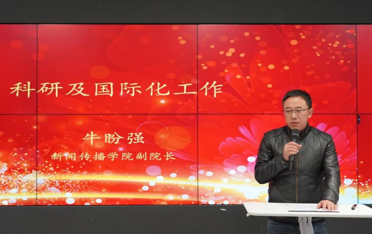 新闻传播学院副院长牛盼强汇报了2025年在科研及国际化工作方面的重点工作。包括实现省部级一等奖目标、科研经费目标、国家级基金立项、CSSCI论文发表以及留学生招生目标等,还涉及了教育部哲学社会科学实验室的申请和学院支持老师参加国际高水平学术会议等。此外,他强调,学院国际新闻传播教育项目已进入第八年,取得了显著成就,未来将继续拓展与日本、荷兰等发达国家的优质高校合作。