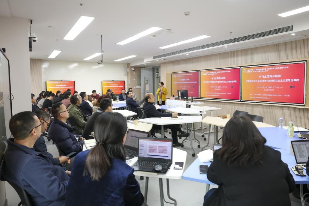 在交流讨论环节,校级名师工作室主持人一一就如何将全国两会最新精神融入课堂教学展开分享。材料科学与工程学院施鹰教授从材料学院的角度出发,强调了国家经济发展的自信和材料科技的创新应用。美术学院桑茂林副教授分享自己在美术教育中融入课程思政的经验。环境与化学工程学院陆永生副教授指出,环境工程专业本身就具有课程思政的天然优势,通过实际案例和项目实践,可以有效提升学生的社会责任感和环保意识。机电工程与自动化学院王志明教授强调新形势下培育学生创新实践能力有着极端重要性,提出将产教融合、科教融合融入学生课堂的做法。体育学院杨小明教授援引钱伟长老校长体育情缘,着重探讨体育强国建设需要培养年轻人强健体魄,体育课程可以培养学生规则意识、抗挫折能力和团队协作精神。