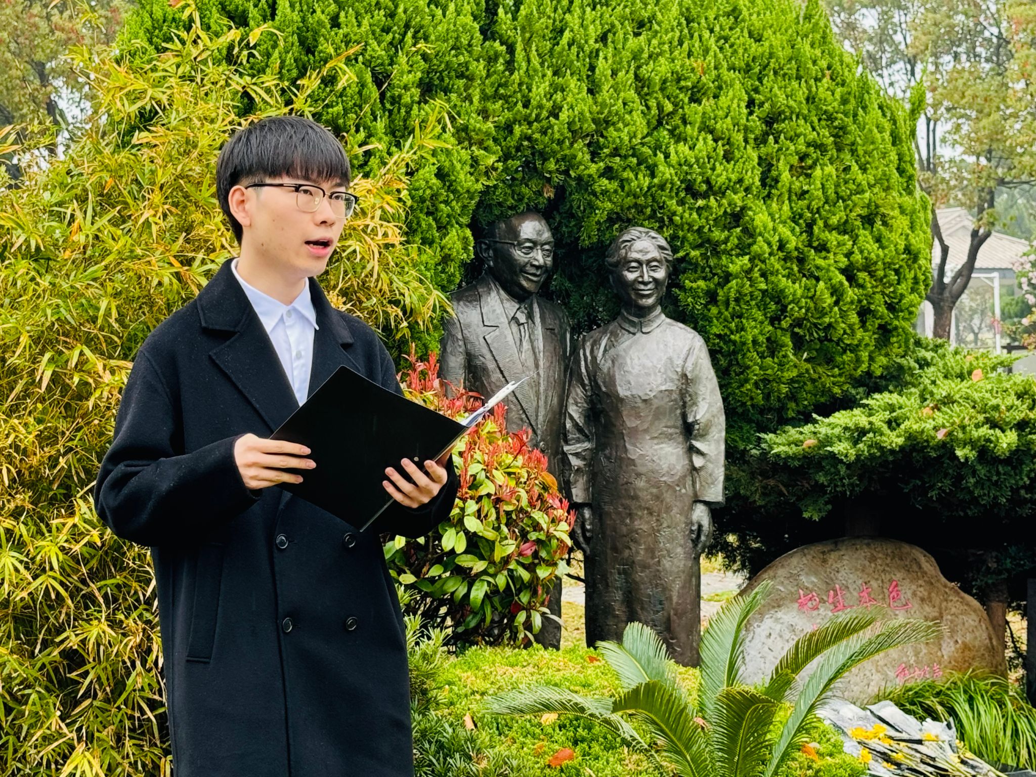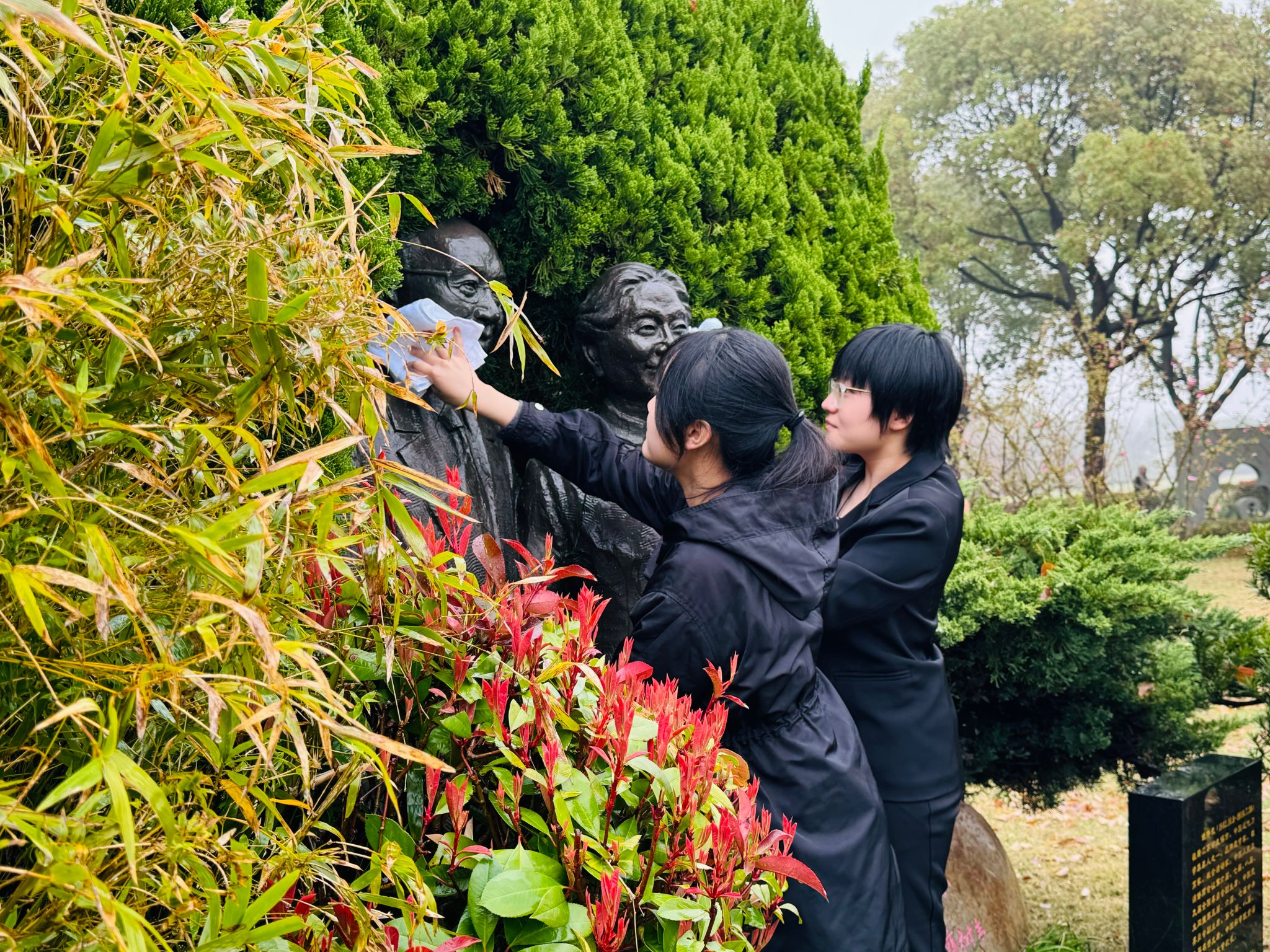 活动伊始,钱伟长学院2025届毕业生褚衍姝、张婕同学用白毛巾轻轻地擦拭钱伟长老校长夫妇的铜像和墓碑,并扫去墓碑周边的杂草与枯叶,每一个动作都表达了对钱老夫妇的爱戴与怀念之情。