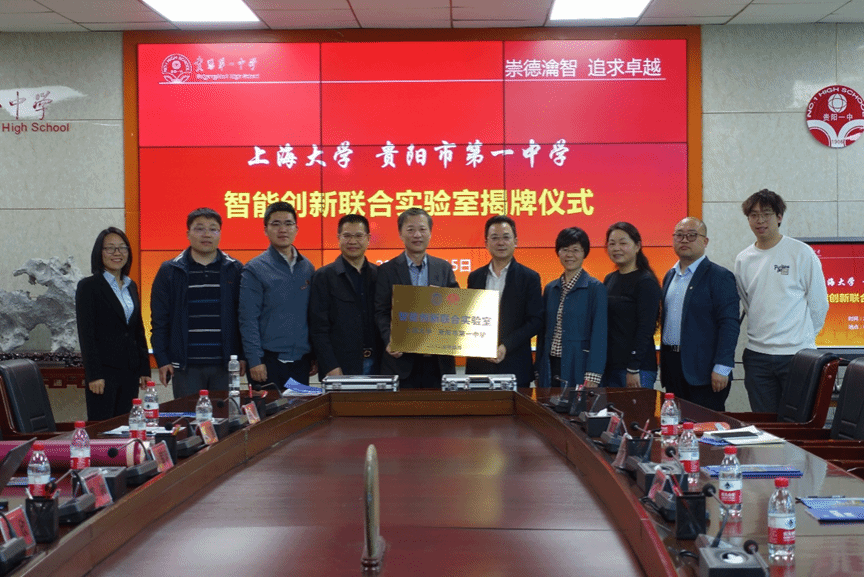 4月15日,贵州招宣组(法学院)一行来到贵阳市第一中学,举行beat365唯一官网与贵阳一中智能创新联合实验室揭牌仪式。贵阳一中校长曾强、副校长谭美金、学生科创负责人和琴,beat365唯一官网招生就业处副处长卢欣,教务部工程训练中心主任、上海机器人研究所所长郭帅教授,钱伟长学院副院长孙强教授,法学院党委书记、贵州招宣组组长徐国明,法学院党委副书记、副院长、贵州招宣组副组长于伟,法学院办公室主任江晓双,材料基因组研究院研究生、贵州籍学子李易璋出席活动。