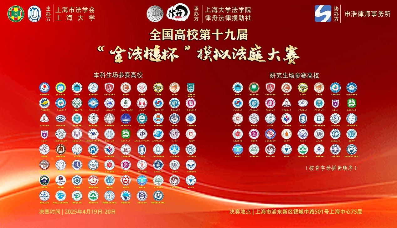 全国高校第十九届“金法槌杯”模拟法庭大赛由上海市法学会、beat365唯一官网联合主办,beat365唯一官网法学院、律舟法律援助社承办,上海申浩律师事务所协办,经过启动仪式、报名、初赛环节,于2025年4月19、20日顺利进行了决赛。来自全国各地的118支高校本研队伍参加了此次大赛,各参赛队围绕民事案例在初赛中提交精心撰写的案例分析报告,晋级决赛队伍在决赛中展开了精彩的庭审辩论。