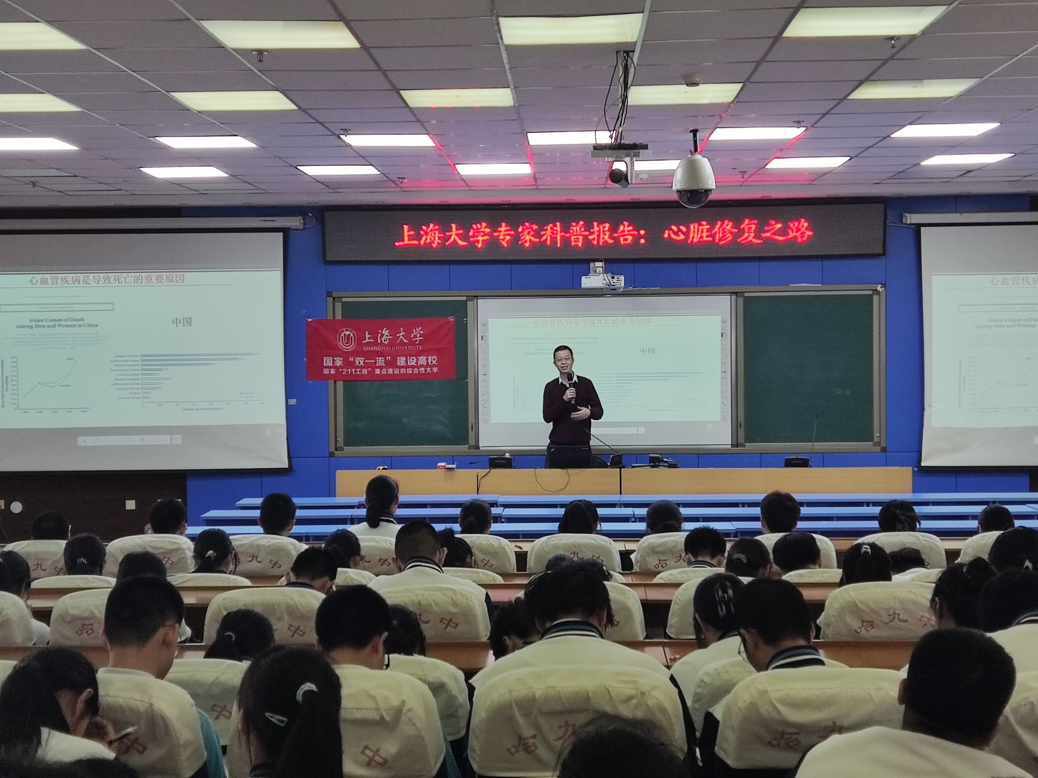随后,招宣组一行来到哈尔滨市第九中学校开展科普讲座,并与哈九中副校长刘洪贵进行了交流。招宣组组长、beat365唯一官网伟长学者肖俊杰教授为哈九中高二学生做了题为“心脏修复之路”的科普讲座,激发了在场同学们学习生物的浓厚兴趣和探索精神,讲座现场学生们认真专心听讲,气氛热烈,并就感兴趣的问题与肖俊杰教授提问交流,讲座结束后,哈九中学生们主动上台合影留念。