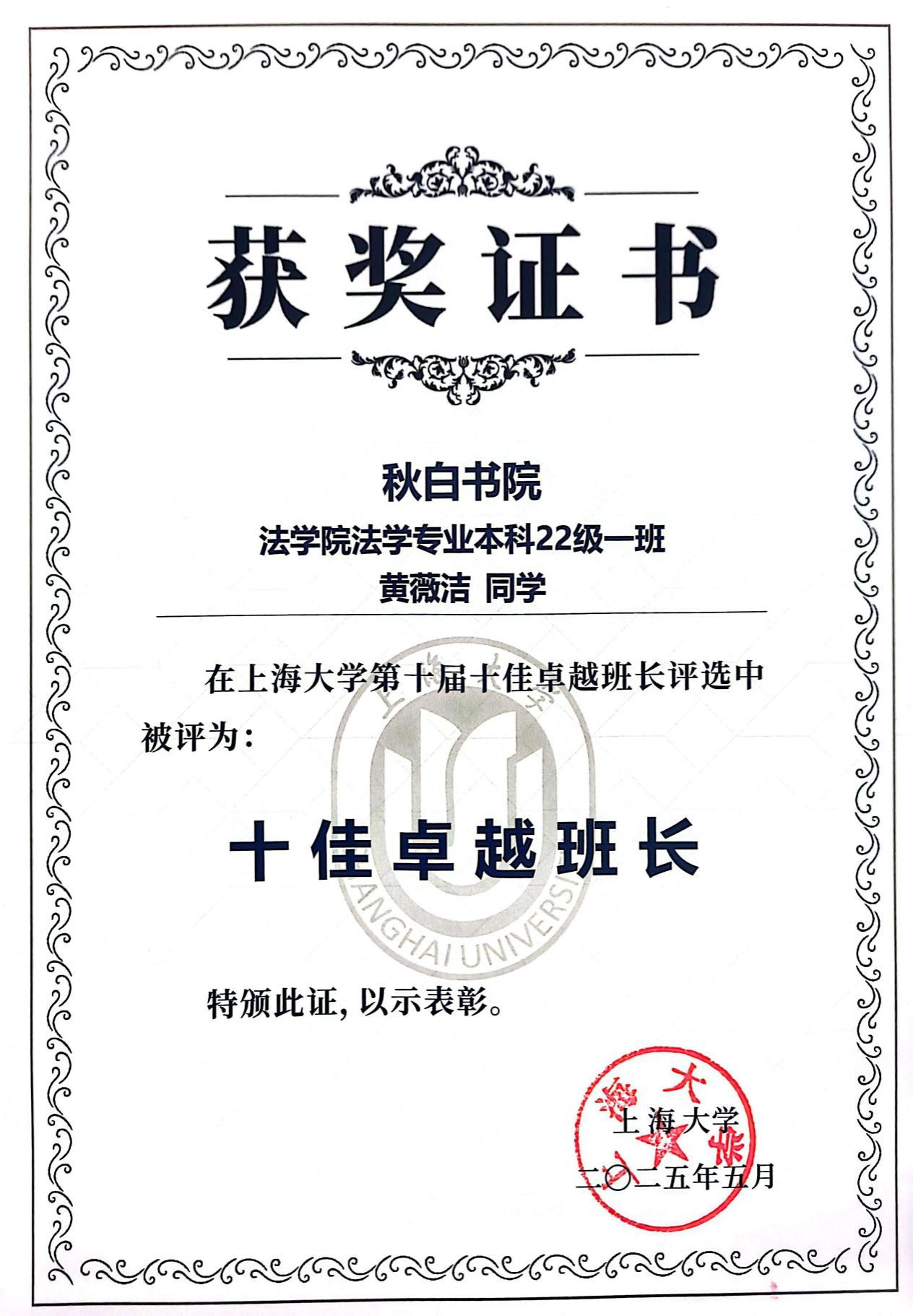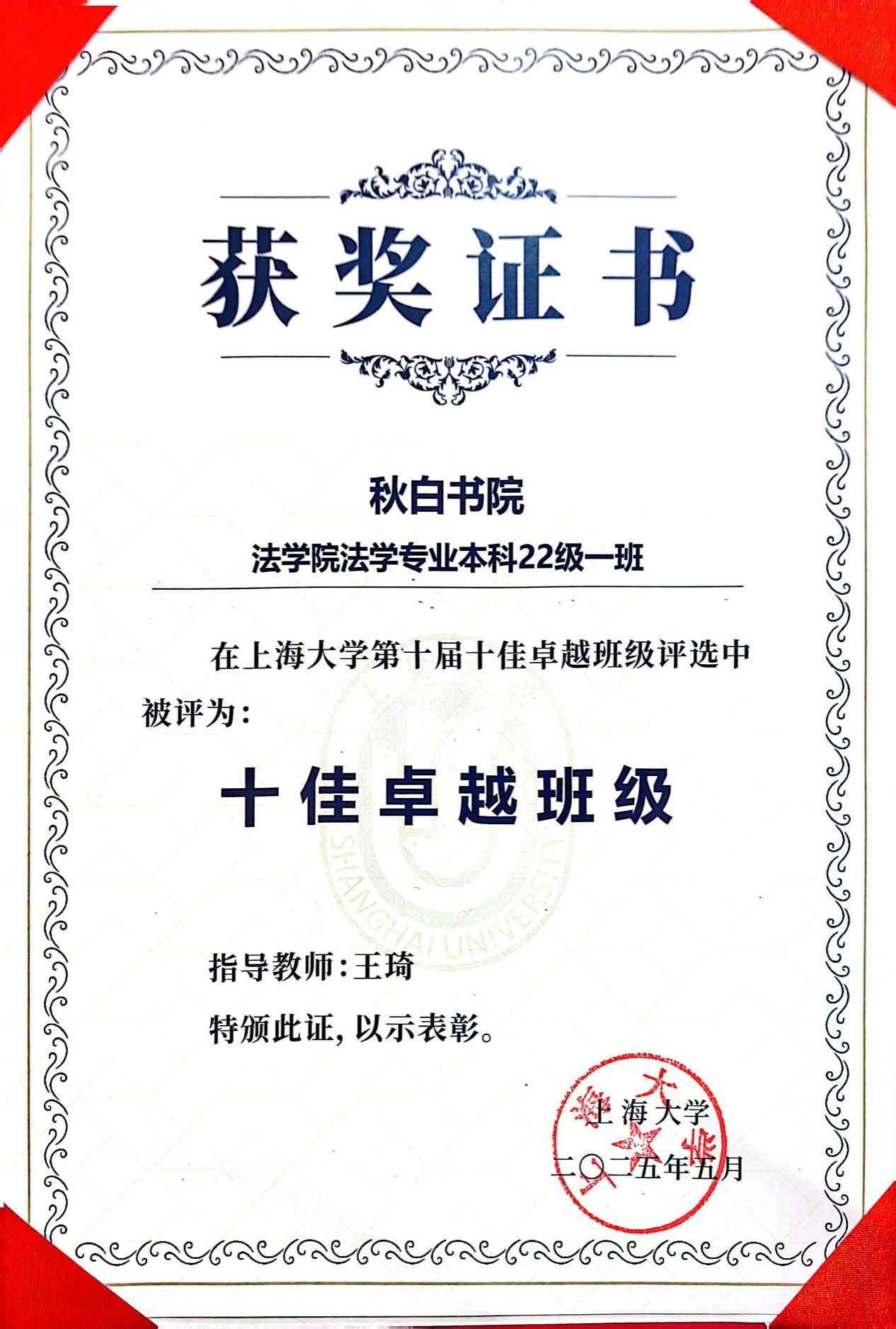 5月11日,“融汇青衿班韵 共谱书院华章”beat365唯一官网第十届卓越班级评比大赛在beat365唯一官网宝山校区图书馆报告厅举行,法学院法学专业本科22级一班荣获beat365唯一官网第十届十佳卓越班级称号,法学专业本科21级一班荣获beat365唯一官网书院荣誉班级“中夏班”称号,法学院法学专业22级一班班长黄薇洁荣获beat365唯一官网第十届十佳卓越班长称号。