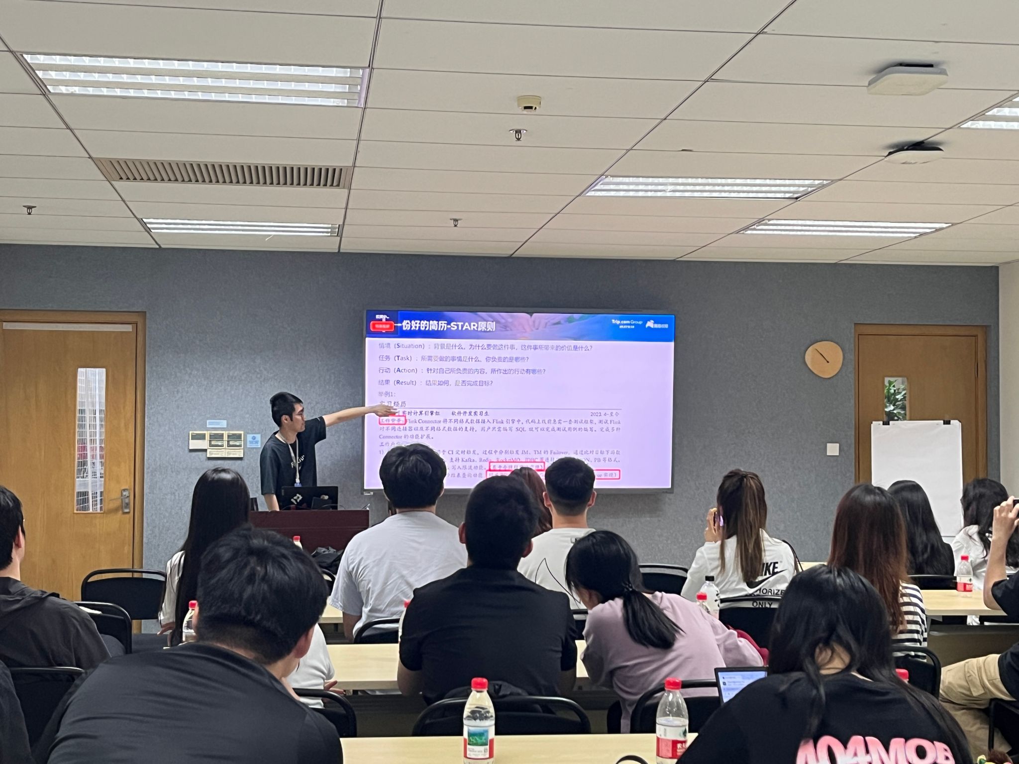 在职业规划分享环节,携程集团吴心希老师展示大量的统计数据,从企业端和学生端两个维度,为同学们带来了全面的就业分析。他指出,在当前形势下,校招市场恢复仍需要时间,offer两极分化趋势增加。除此之外,吴老师也为同学们详细梳理了互联网校招时间表及应聘流程,让同学们对求职环节有了更清晰的规划。接下来,吴老师为同学们重点介绍了携程集团的招聘岗位、T-Star培养框架及丰富的员工福利,展示了企业对人才的重视与培养。最后,吴老师从企业HR的角度出发,为同学们分享了一系列实用的求职tips,包括简历撰写技巧、面试注意事项等,为同学们的求职之路提供了指导。分享结束后,同学们踊跃提问,现场气氛热烈。