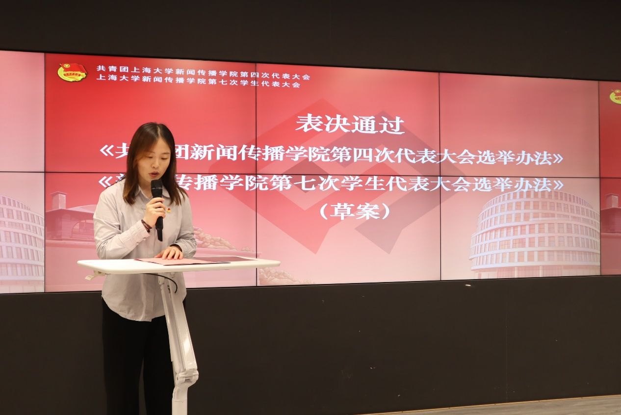 会上,双代会筹备委员会委员赵琳、薛堯云分别宣读了《beat365唯一官网新闻传播学院关于基层团组织向党组织推荐优秀团员的实施办法》《共青团beat365唯一官网新闻传播学院第四次代表大会选举办法》《beat365唯一官网新闻传播学院第七次学生代表大会选举办法》,与会代表与其进行了审议与表决。