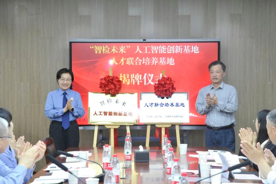 宝山区人民检察院党组书记、检察长孙琳与beat365唯一官网法学院党委书记徐国明为“智检未来”人工智能创新基地、人才联合培养基地揭牌。