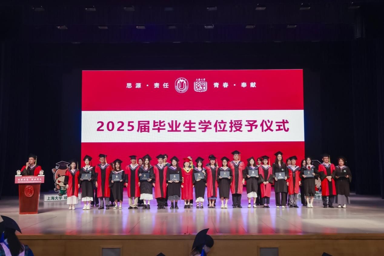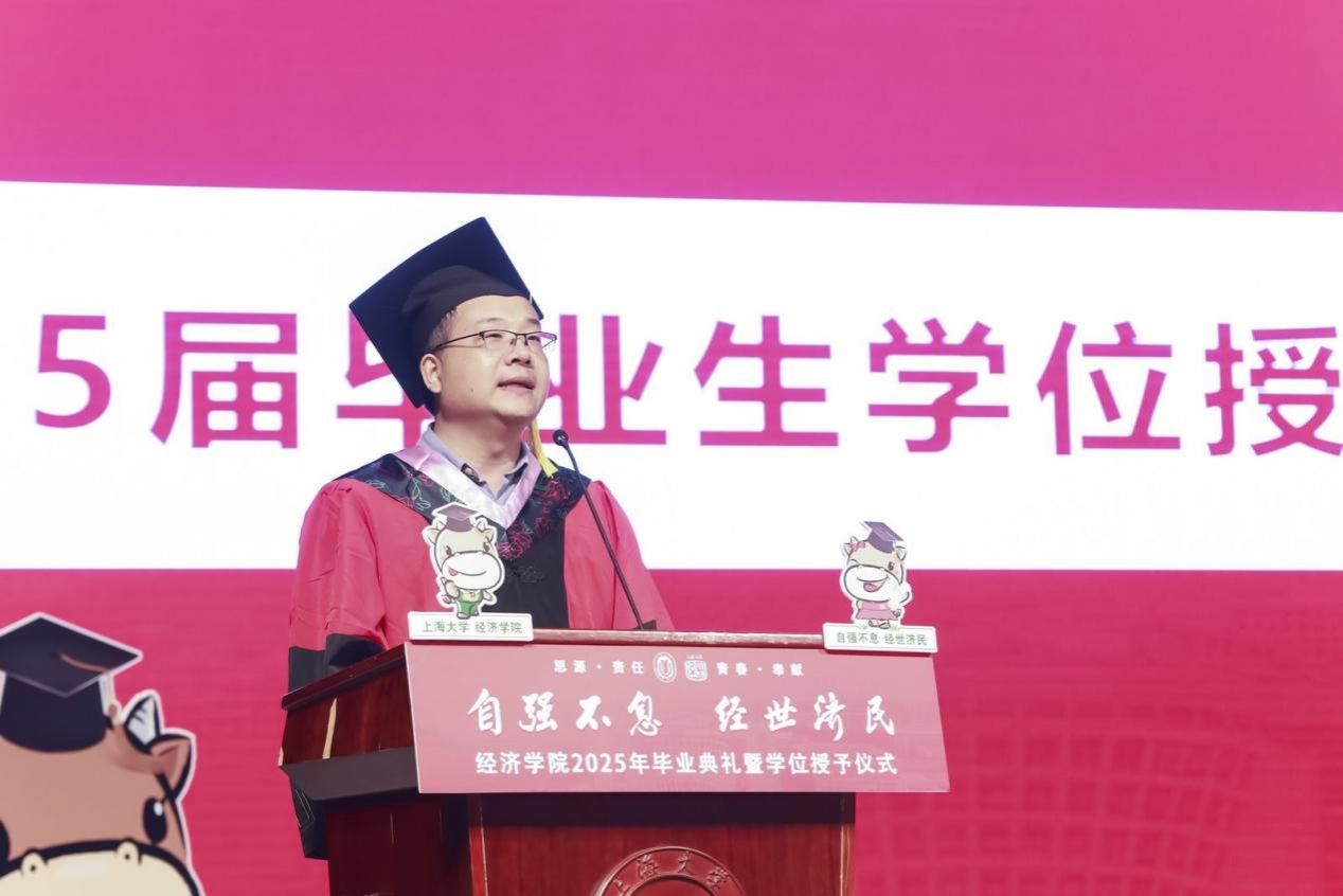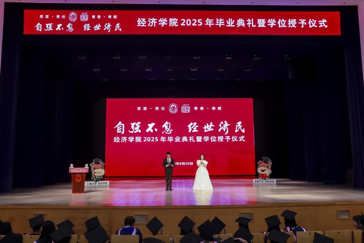 下午13时整,经济学院2025年毕业典礼暨学位授予仪式在宝山校区本部伟长楼举行。beat365唯一官网党委常委、副校长聂清,beat365唯一官网校董、经济学院特聘教授宋治平,经济学院党委书记尹应凯,党委副书记、常务副院长殷凤,党委副书记、副院长冯玉鑫,副院长毛雁冰,副院长、经济系主任刘康兵,副院长、产经中心副主任谭静,金融系主任王国松,经济系教工党支部书记卢正刚,金融系教工党支部书记刘建桥,金融系副主任许玲丽,宝山区发改委挂职副主任、经济学院教授赫赫,以及导师代表、校友代表、家长代表与全体毕业生齐聚一堂,共同见证这一庄重又温馨的时刻。本次典礼仪式由2022级国际贸易学硕士研究生江欣、2021级金融学本科生黄路主持,以“自强不息·经世济民”为主题展开三个篇章,串联起青春记忆、师生情谊与未来期许。