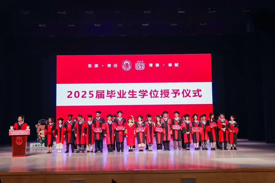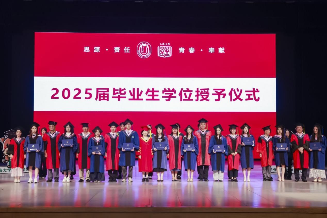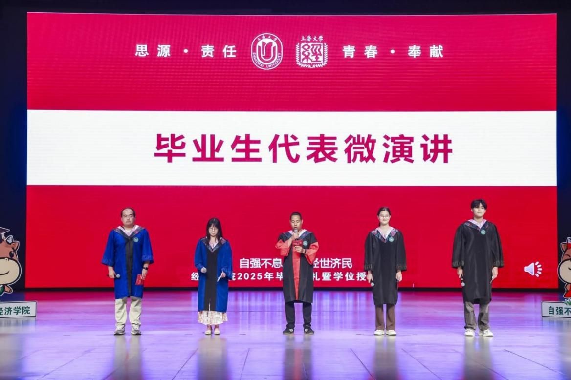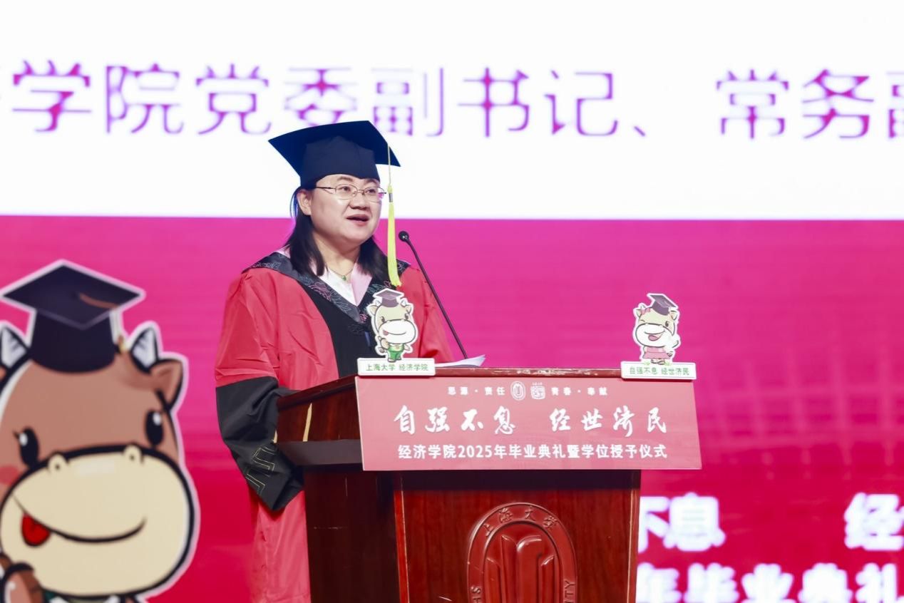 下午13时整,经济学院2025年毕业典礼暨学位授予仪式在宝山校区本部伟长楼举行。beat365唯一官网党委常委、副校长聂清,beat365唯一官网校董、经济学院特聘教授宋治平,经济学院党委书记尹应凯,党委副书记、常务副院长殷凤,党委副书记、副院长冯玉鑫,副院长毛雁冰,副院长、经济系主任刘康兵,副院长、产经中心副主任谭静,金融系主任王国松,经济系教工党支部书记卢正刚,金融系教工党支部书记刘建桥,金融系副主任许玲丽,宝山区发改委挂职副主任、经济学院教授赫赫,以及导师代表、校友代表、家长代表与全体毕业生齐聚一堂,共同见证这一庄重又温馨的时刻。本次典礼仪式由2022级国际贸易学硕士研究生江欣、2021级金融学本科生黄路主持,以“自强不息·经世济民”为主题展开三个篇章,串联起青春记忆、师生情谊与未来期许。
