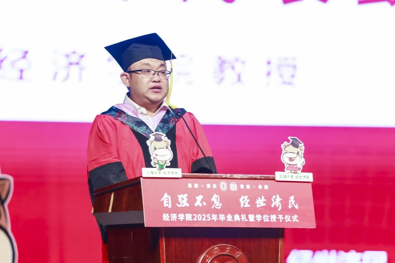 在导师祝福环节,经济学院教授、宝山区发改委挂职副主任赫赫为毕业生们送上谆谆寄语。赫赫老师娓娓道来,饱含温情与期许,祝福毕业生“专”于一业、“传”于众人、“转”化价值,更能“赚”得信任,赚得尊重,赚得爱与生命的厚度。