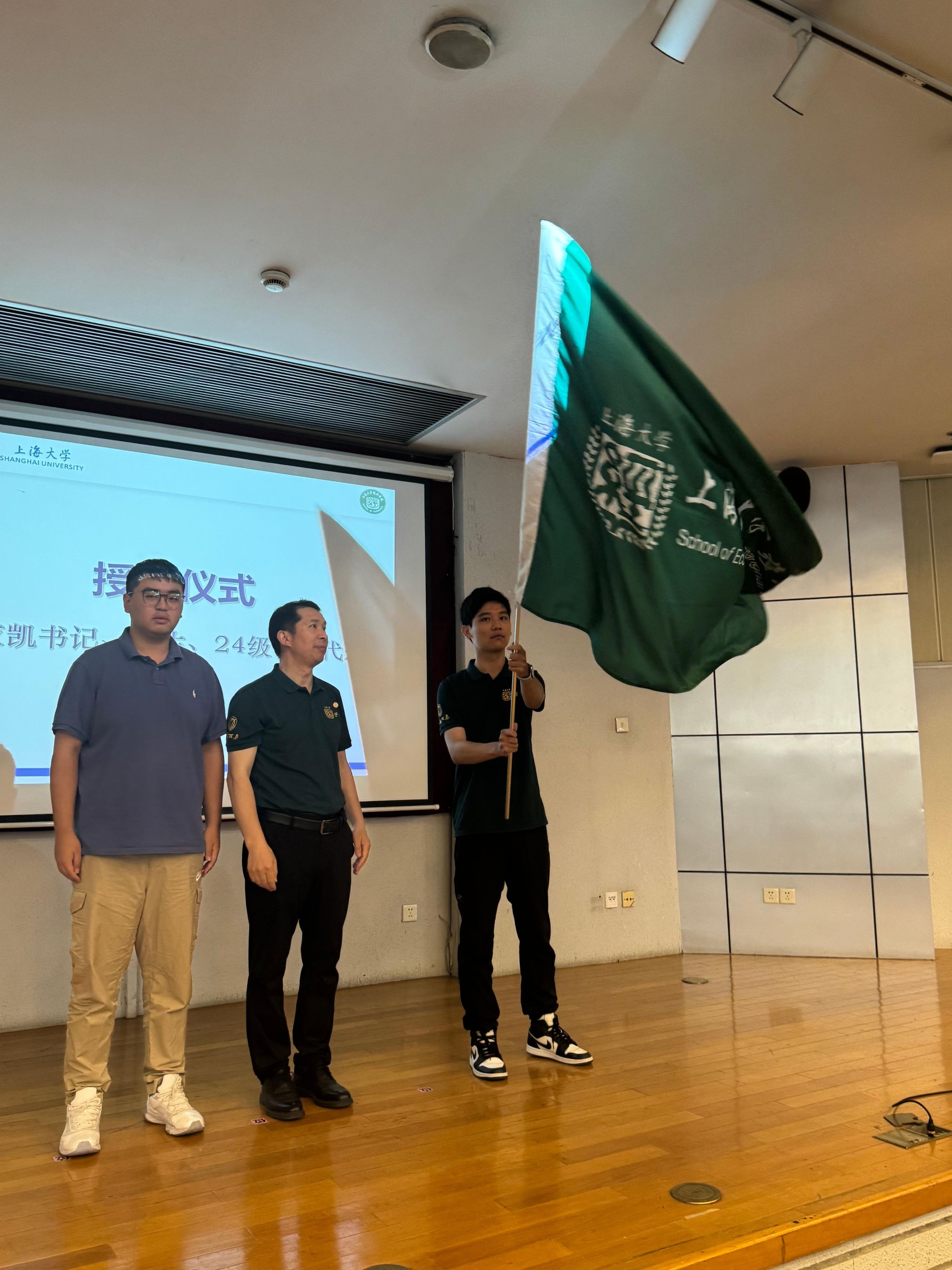 授旗仪式将气氛推向高潮,尹应凯郑重地将象征着学院精神与传承的旗帜授予24级新生代表袁宇飞同学,经院旗帜在学生手中展开,承载着沉甸甸的期望。随后,刘康兵副院长为新生代表佩戴上精致的院徽,一枚枚院徽闪耀在胸前,标志着新生们正式成为经济学院大家庭的一员,肩负起“经世济民”的使命。