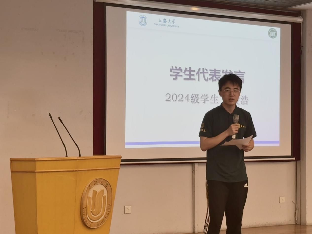 学生代表余凌浩发言,以“Passion”为主题,分享了自己大一期间在学业和生活的经历,随后他讲述了学院提供的企业参访、讲座等及辅导员的关怀,结合生活场景阐述经济学对认知社会的作用,最后强调Passion是支撑前行的动力,体现为热爱与坚持,呼吁同学们在大学时光中以热情互相帮助、共同成长。