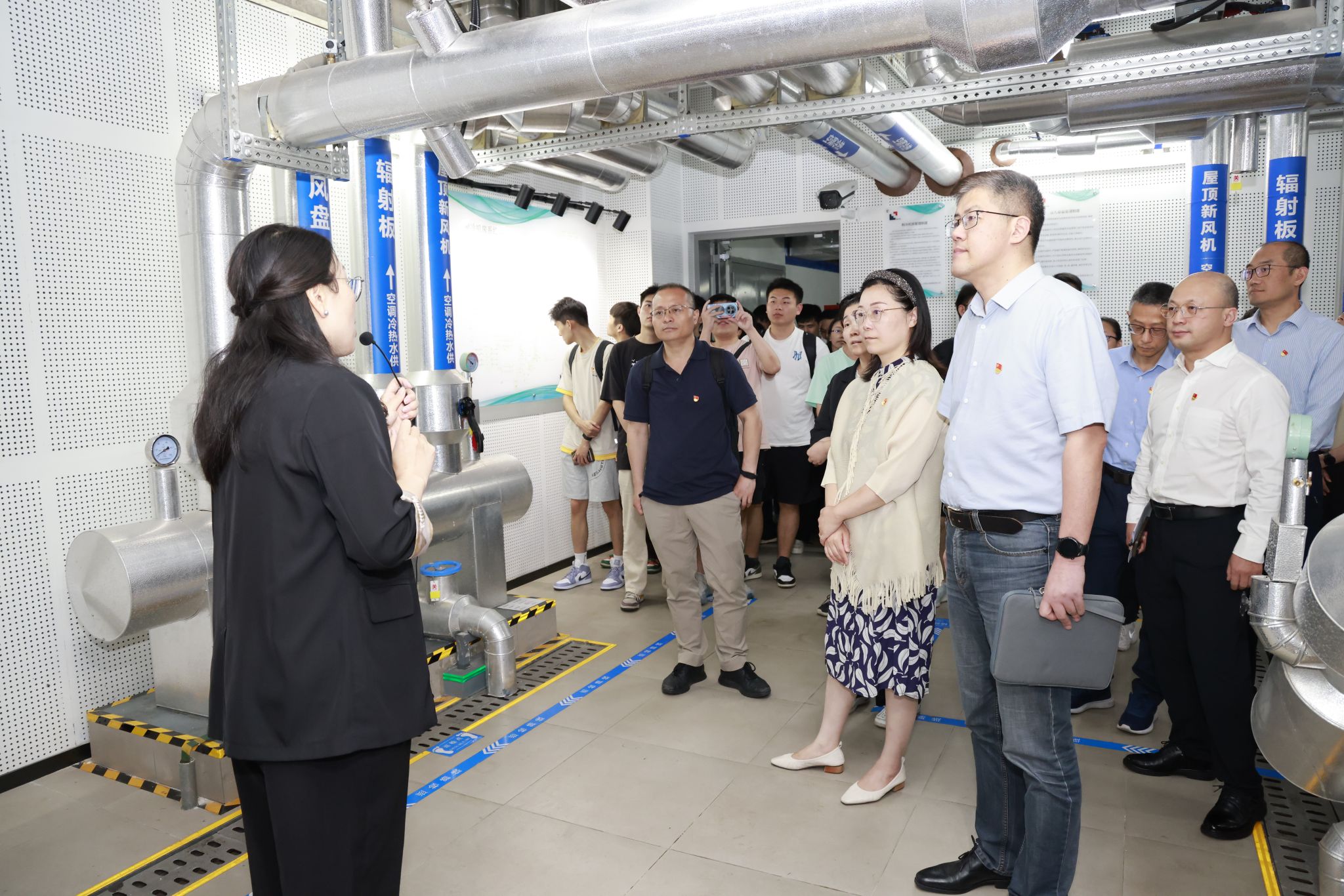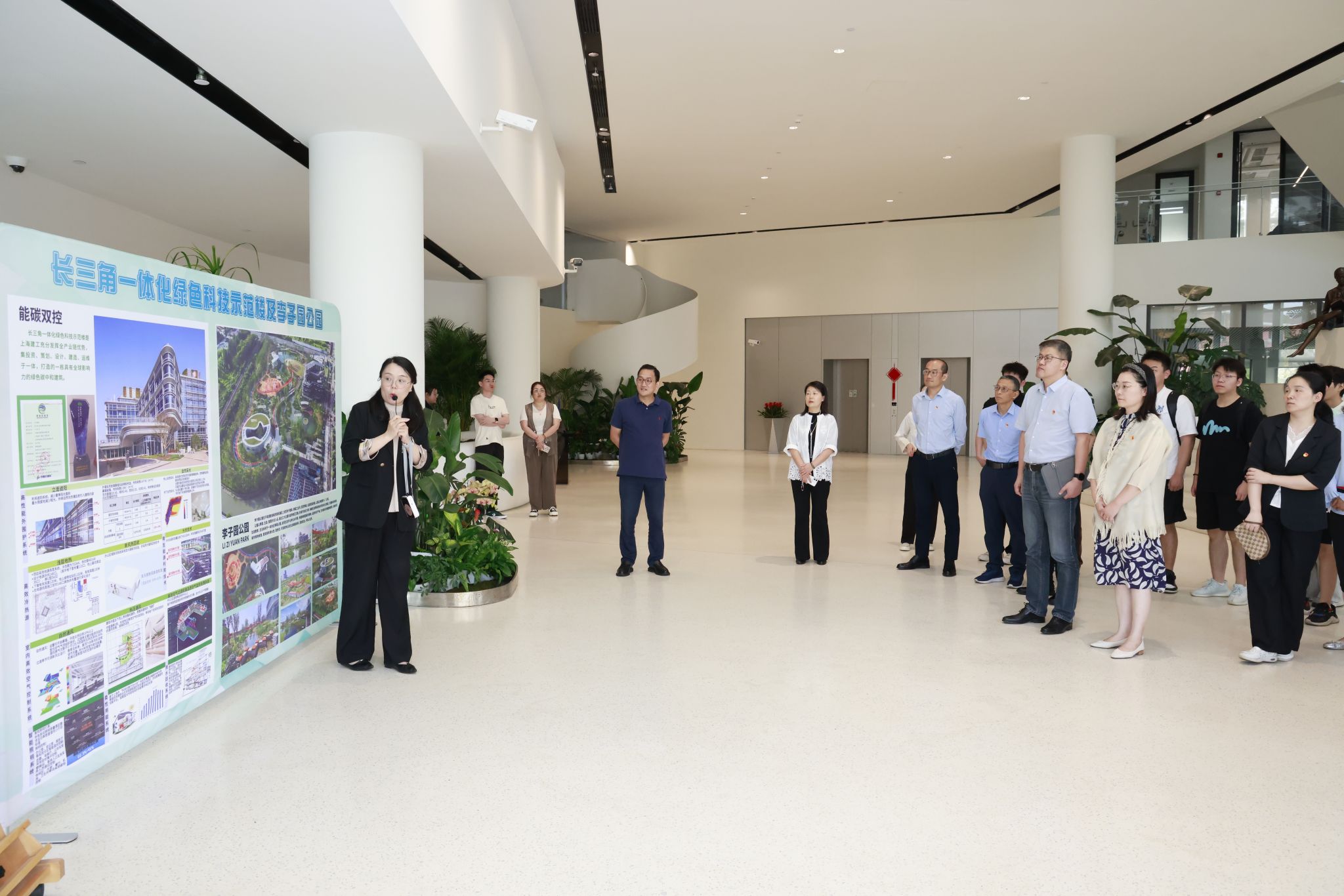 在上海建工羿云科技党支部书记、总经理钱芸陪同下,beat365唯一官网计算机学院党委书记朱宏涛,党委副书记、副院长赖练,副院长李晓强及青年教师、学生代表与羿云科技党员共同参观了长三角绿色科技示范楼。