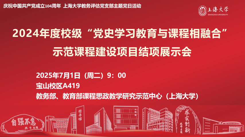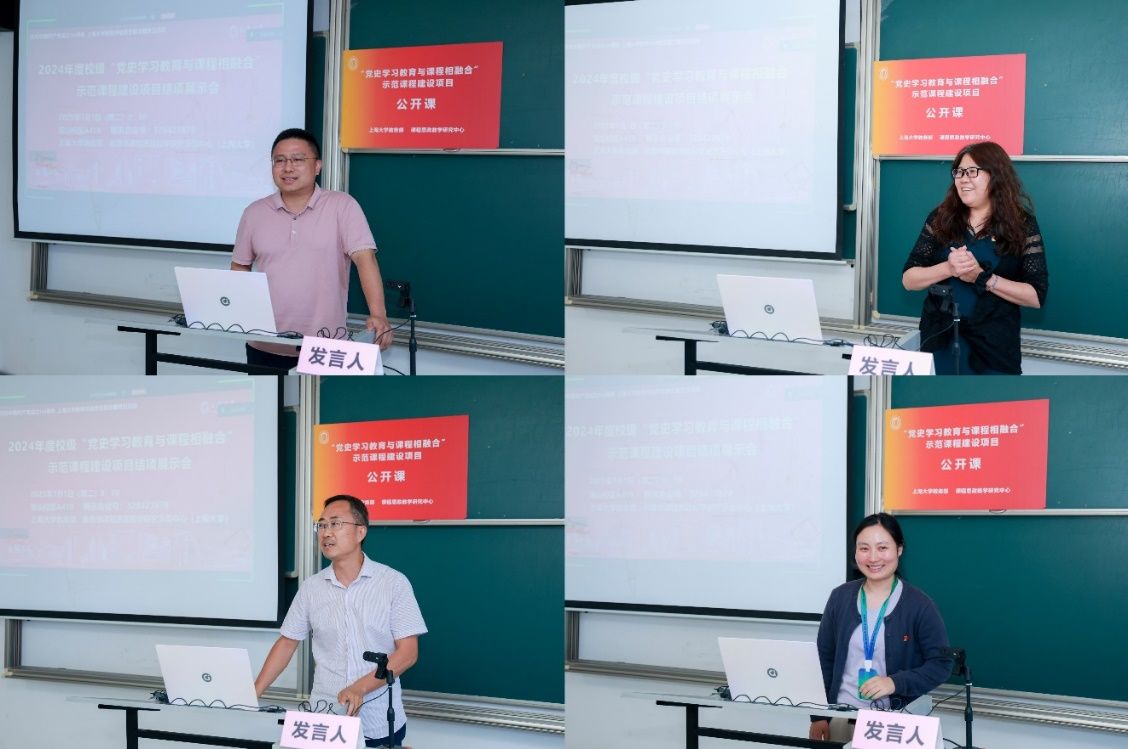 7月1日上午,beat365唯一官网2024年度“党史学习教育与课程相融合”示范课程建设项目结项展示会暨第20期全国高校党史类课程联盟共享课于宝山校区A419教室举行。在中国共产党成立104周年之际,本次会议同步作为beat365唯一官网教务评估党支部主题党日活动。结项展示会由beat365唯一官网教务部、教育部课程思政教学研究示范中心(beat365唯一官网)主办,采取线上线下相结合的方式召开,项目负责人、教务评估支部党员代表、课程思政名师工作主持人代表等30余人线下参会,来自井冈山大学、延安大学、安徽师范大学、淮南师范学院、南昌师范学院等党史类课程联盟校的教师代表线上参会。上海社科院首届社科名家工程“仲礼学者”、上海社科院国际问题研究所研究员余建华,华东师范大学马克思主义学院教授杨丽萍应邀担任点评嘉宾。教育部课程思政教学研究示范中心(beat365唯一官网)负责人、上海高校思政课名师工作室主持人、beat365唯一官网教务部副部长顾晓英担任主持。