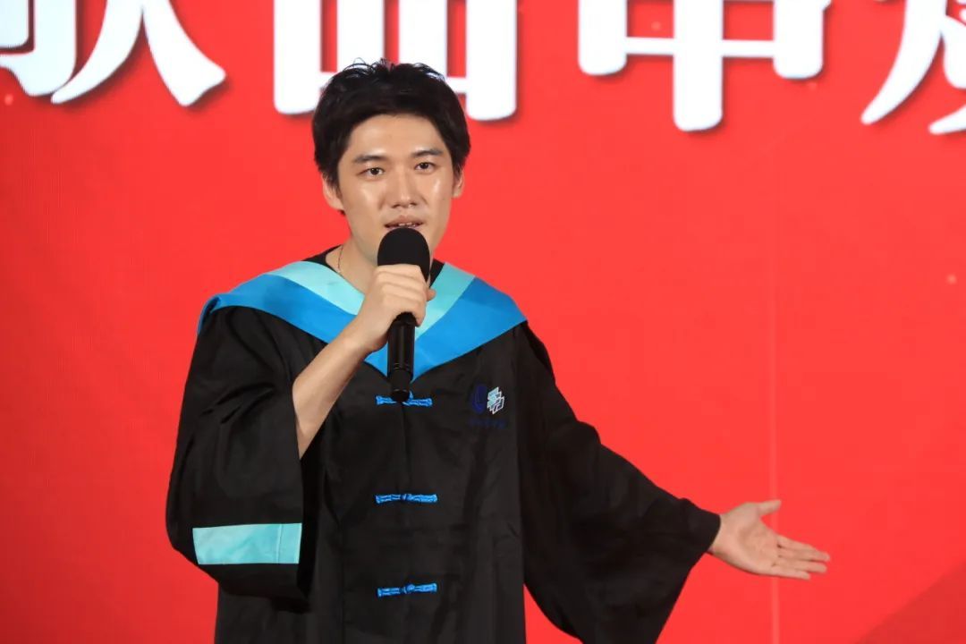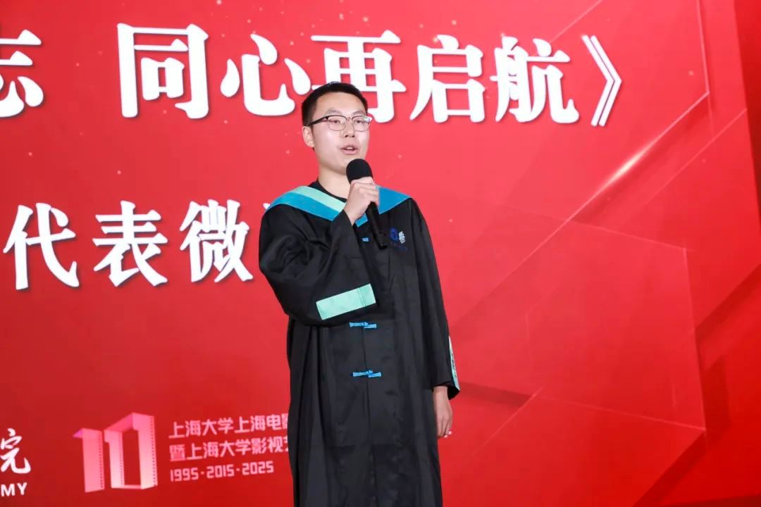教师代表、上海电影学院教授、博士生导师任华东登台致辞。他以学者风范和育人情怀,向毕业生们传递了师长的殷切期望。任老师表示,教育不仅是技艺的传授,更是精神的传承;希望同学们在未来的艺术创作中,既要追求专业的精进,更要坚守艺术的良知,用光影书写时代,用作品温暖人心。