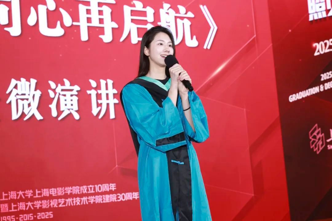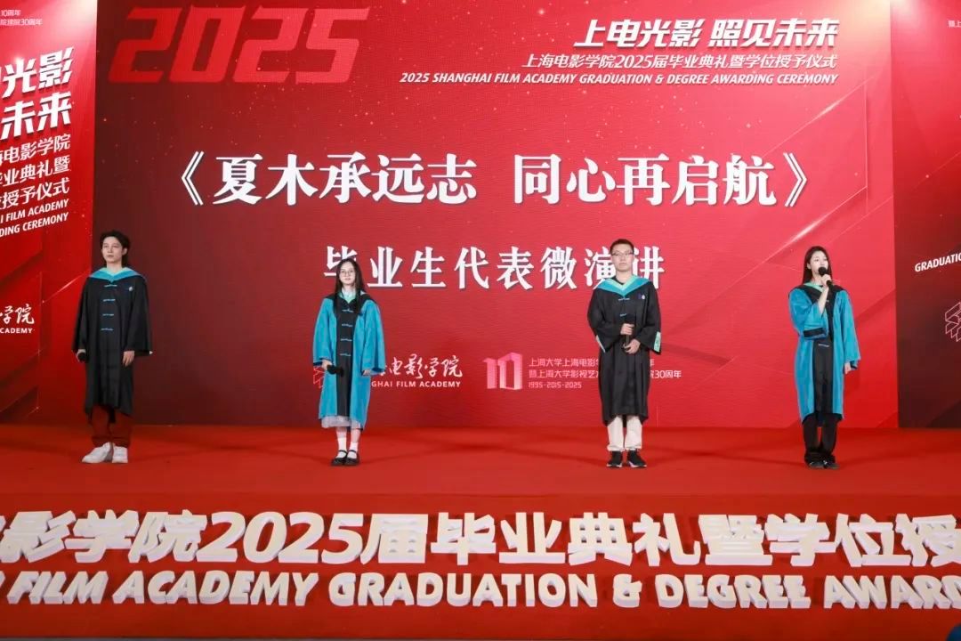来自21级表演系本科生魏春雨、21级戏剧影视文学专业本科生张弛、 22级计算机应用技术硕士研究生毛靖怡和22级MFA导演方向研究生范修竹共同带来了微演讲《夏木承远志 同心再启航》。四位学子以真挚动人的讲述,带领我们重温了他们在上海电影学院的成长轨迹——那些满载收获的求学时光、镌刻青春印记的同窗情谊,以及经历专业淬炼后,对艺术梦想的执着追求与坚定信念。这场演讲不仅是对过往的深情回望,更是面向未来的铿锵宣言。