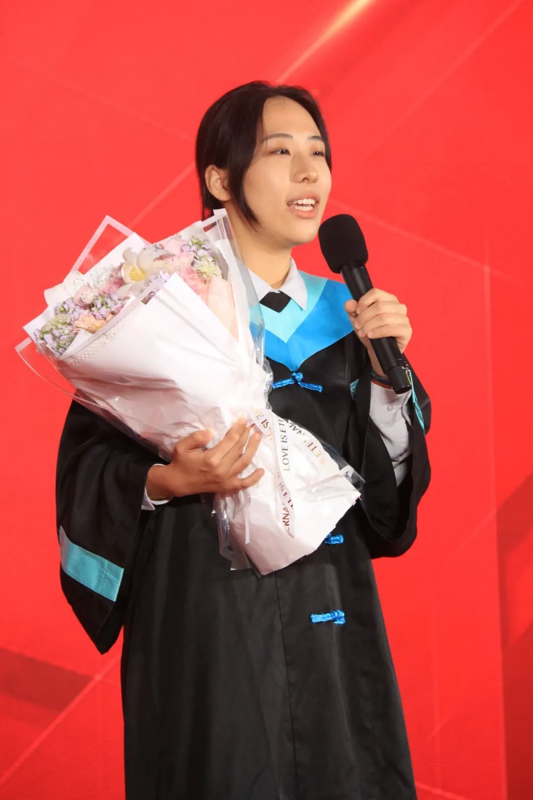 2021级电影制作专业毕业生周少卿的母亲姚育芳女士作为家长代表,向全体毕业生送上殷殷嘱托。她深情回顾了孩子们在求学路上的点滴成长,那些追逐梦想的执着,都让在场的父母们既心疼又自豪。姚女士表示,正是孩子们对电影艺术的热爱与坚持,让他们从青涩学子蜕变为今日的栋梁之才,这份成长是给父母最好的礼物。她代表所有家长祝愿毕业生们怀揣理想,在光影世界里绽放更耀眼的光芒。