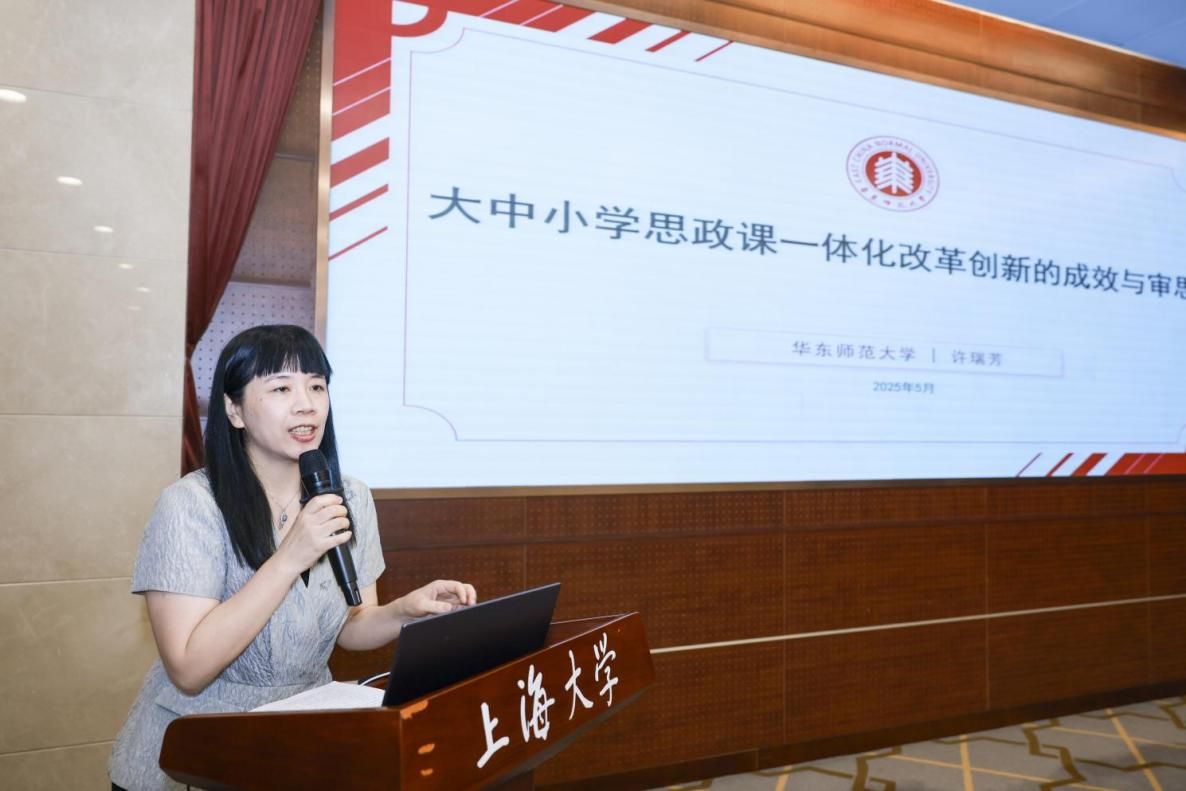 会议主旨报告环节由《文汇报》理论评论部主任杨逸淇主持。华东师范大学马克思主义学院副院长许瑞芳教授作题为《大中小学思政课一体化改革创新的成效与现实审思》报告。她从内涵解读出发阐述了大中小学思政课一体化建设的成效,并基于衔接论、过程论和系统论阐明大中小学思政课一体化建设的遵循,通过全国范围的调研数据与实际运行现状阐释大中小学思政课一体化改革创新的举措和方案,并对当前大中小学思政课一体化建设中存在的问题进行了反思。